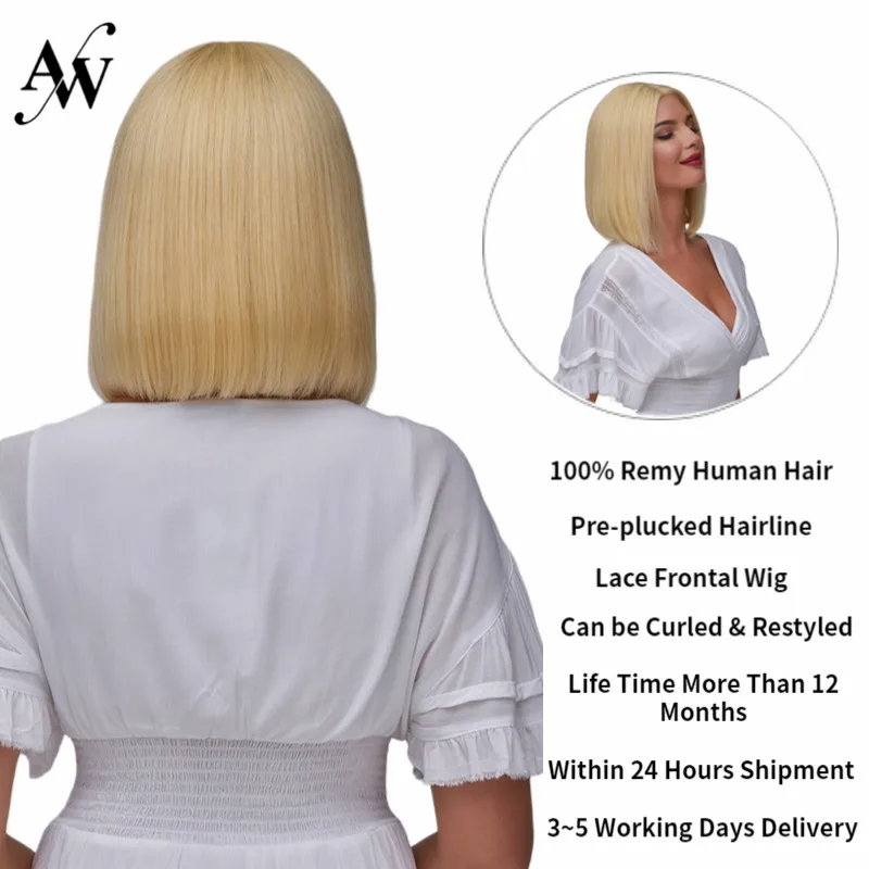 AW 12'' Blond Short Bob Lace Front Remy Humam Hair Wig HD Transparent Pre Plucked Hairline Half Lace Wig For Women 150% Density