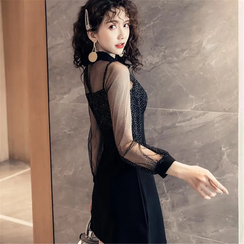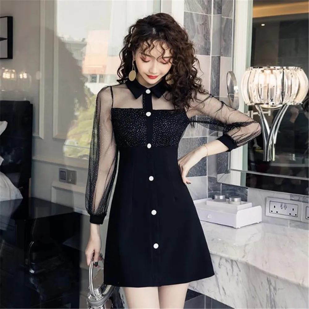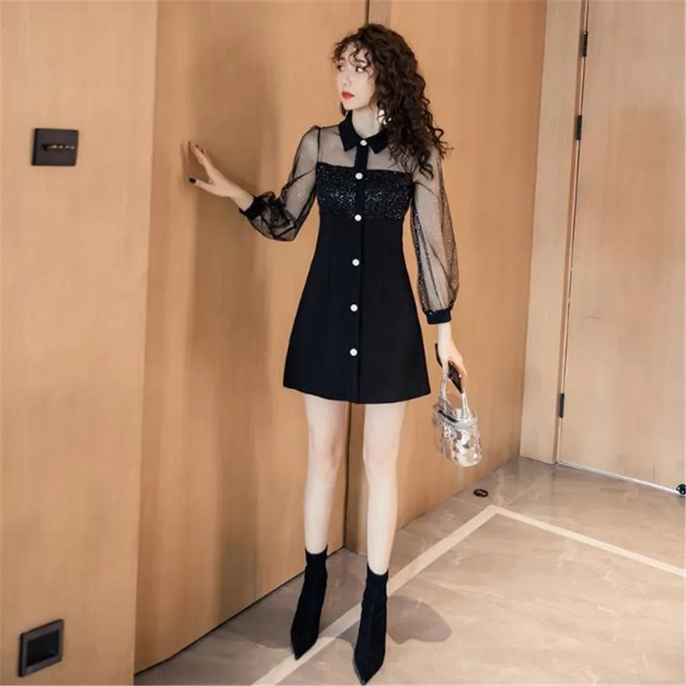 Женское платье, летнее, весеннее, Осеннее, с пышными рукавами, Сетчатое, черное, Короткое мини-платье, а-силуэт, элегантные, вечерние, Клубные, размера плюс, vestidos