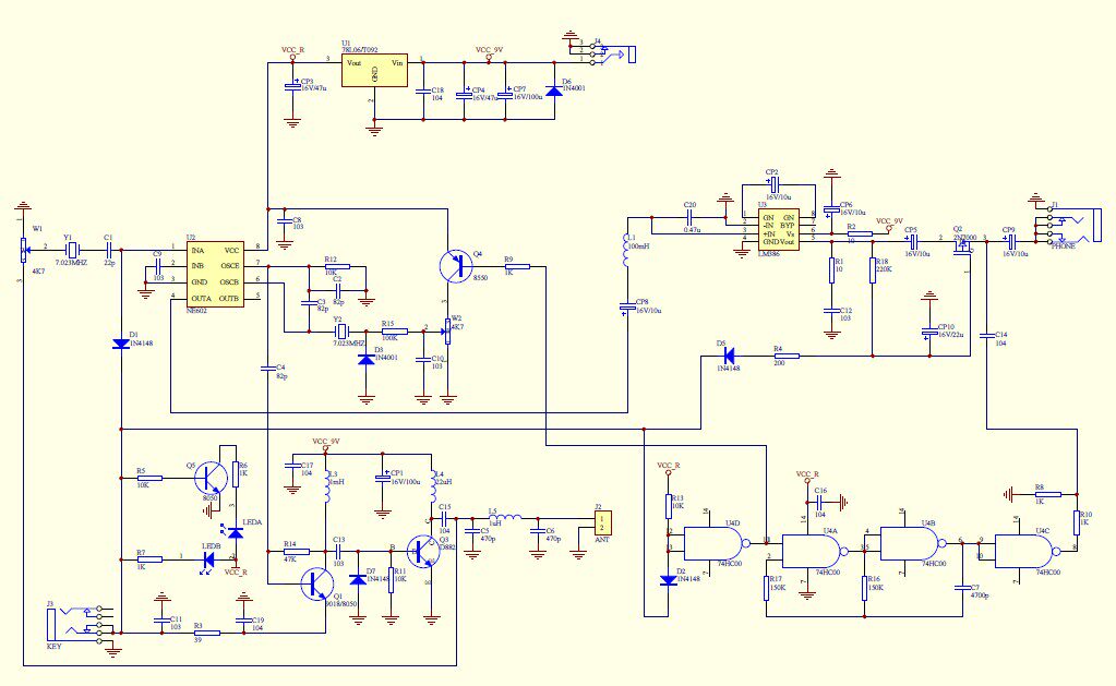 Note: The MOS field effect tube 2N7000 in the kit should be soldered as the last component. In order to prevent electrostatic breakdown, the 2N7000 should be disconnected from the power source of the soldering iron and soldered with residual heat. The kit does not include antenna power headset keys. brief introduction This is a very compact and simple 40-meter band micropower equal-amplitude telegraph transceiver, powered by a 9V square battery. When the transmission is better, you can communicate with amateur radio stations in nearby provinces within hundreds of kilometers. This circuit was originally designed by foreign countries. It has stable frequency, good selectivity, high receiving sensitivity, and strong code readability. It can be used as a practical device for CW communication of radio enthusiasts! main indicators Power supply: DC 9V-14V Antenna: 50 ohms, unbalanced Receive static current: 12mA 9V Transmitting power: 12V / 3W, 9V / 2W Frequency range: Transmit local oscillator 7.023MHz, receive local oscillator 7.023-7.026MHz (7.023MHz crystal) Working mode: CW Circuit principle The core of the receiving part is an NE602. After the signal from the antenna passes through a crystal filter and attenuation potentiometer, it enters the mixer. The oscillation circuit oscillates at the receiving frequency. After the two signals are mixed, they directly report the SSB / The CW signal is converted into audio, and the audio output from NE602 is sent to LM386 for amplification, thus completing the entire process. Therefore, a receiver that directly mixes radio frequency signals into audio is called a "DC receiver". The transmitting part uses the NE602 oscillation circuit, and then uses 9018 as a buffer amplifier. 9018 also serves as a transmission key to control the switching of the transceiver circuit and the signal. The final stage is a Class C amplifier composed of D882. The amplified high-frequency signal passes through the LPF. The antenna is connected after filtering. Component selection The magnification of 9018 is about 130, and the magnification of D882 is about 200. L4 is a high-frequency choke coil. Use FT37-43 (American magnetic ring) ferrite ring (black) to use 0.51mm enameled wire for 11 turns, about 20cm (can also use fixed inductors on the market instead), The inductance is around 20uH. L5 is a high-frequency filter inductor. On the T37-2 (American magnetic ring) iron powder core magnetic ring (red), use 0.51mm enameled wire or network wire to wind 16 turns, about 25cm, and the inductance is about 1uH. Other inductors: 1mH is a fixed color ring inductor, 100mH is a cylindrical fixed inductor, and is covered with a black heat-shrinkable sleeve. All capacitors smaller than 1000pF are high-frequency ceramics, 0.47uF capacitors are monolithic capacitors, capacitors larger than 1uF are aluminum electrolytic capacitors, and all resistors are 1 / 4W 5% fixed resistors.