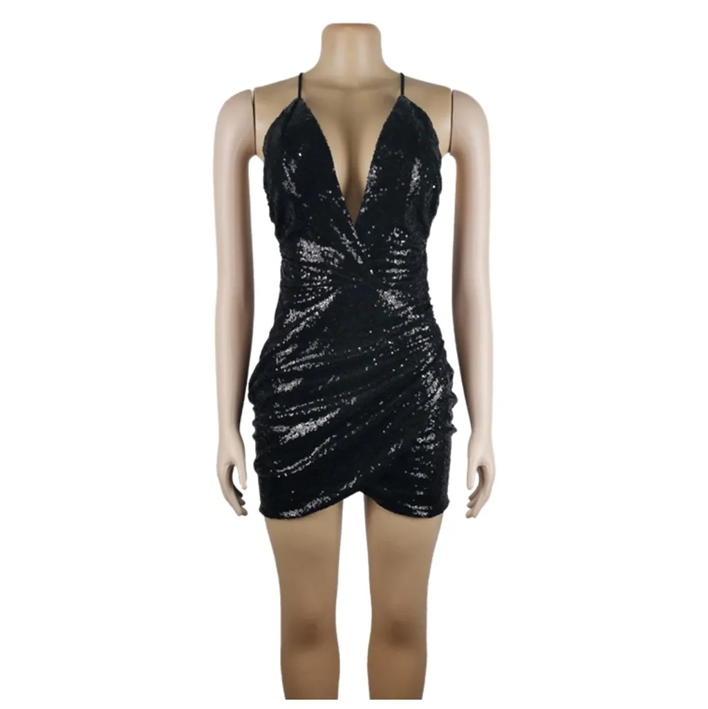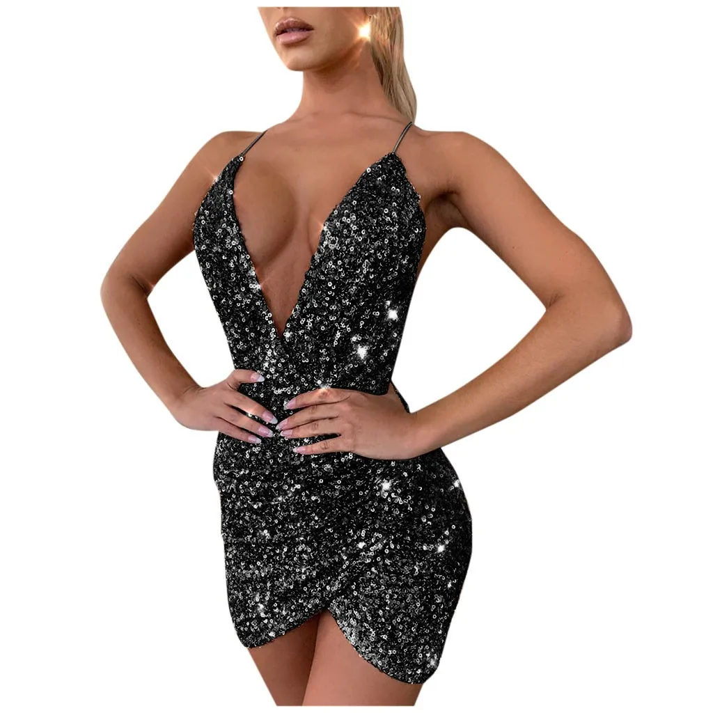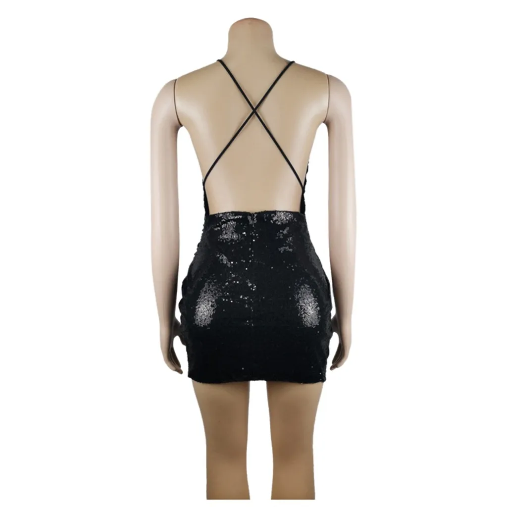 Женское модное однотонное мини-платье с блестками и v-образным вырезом, платье с открытой спиной