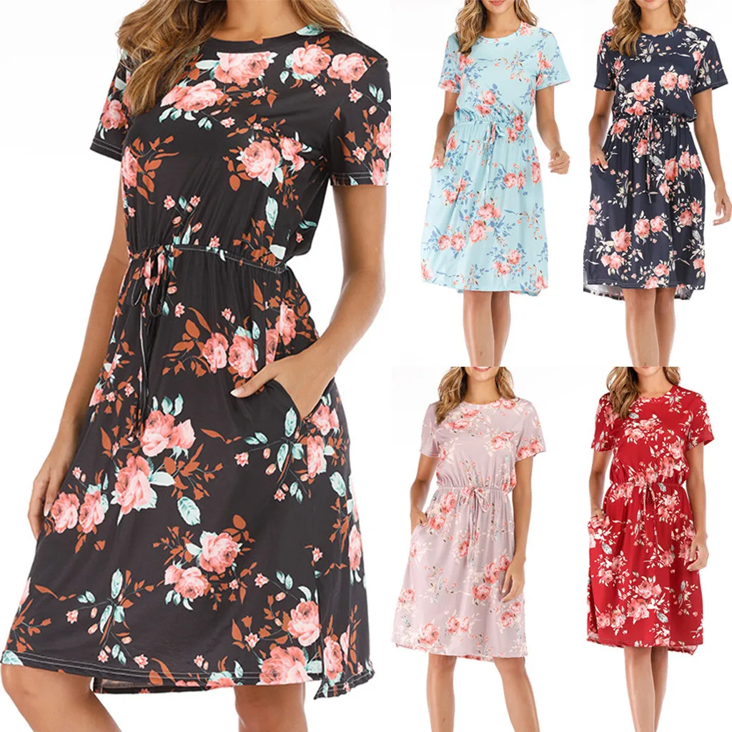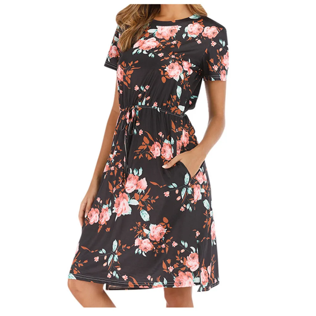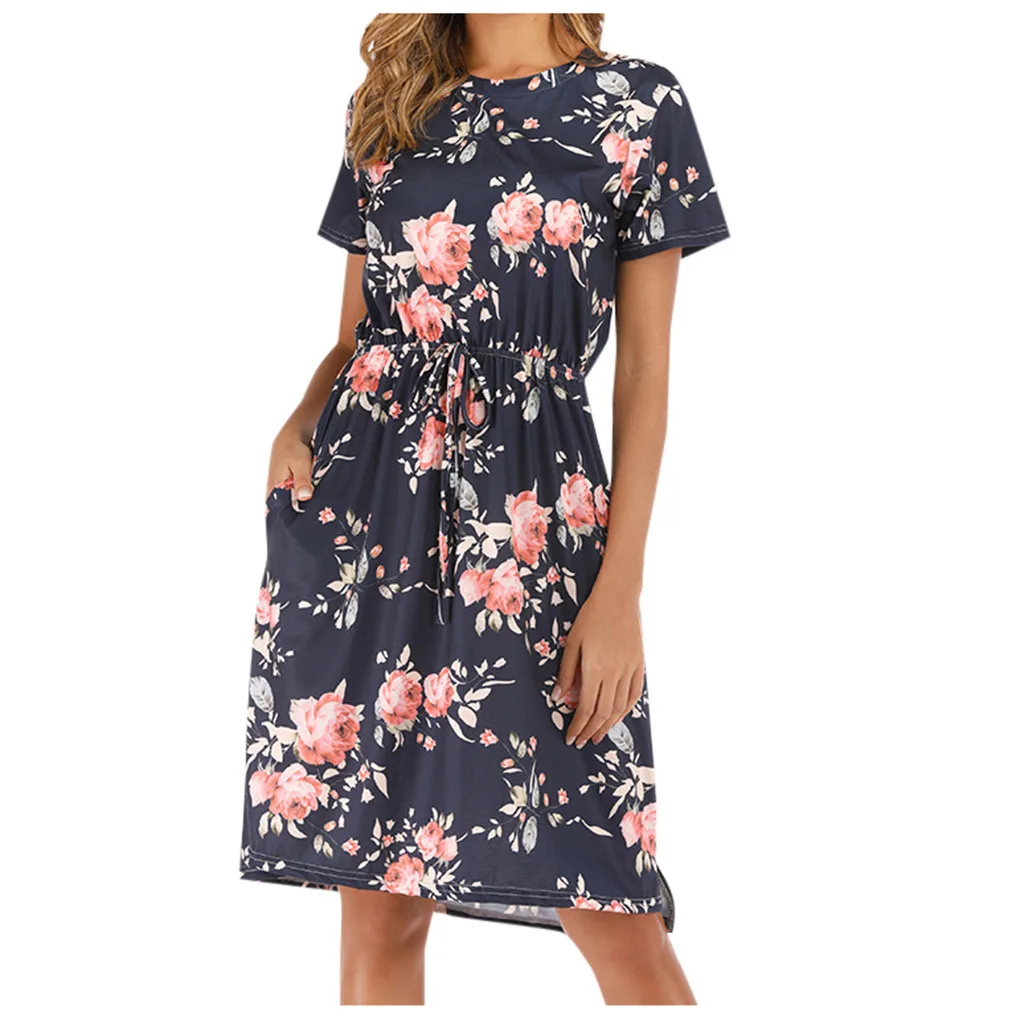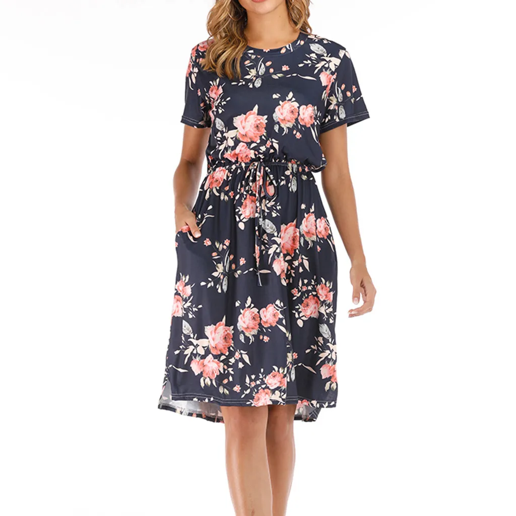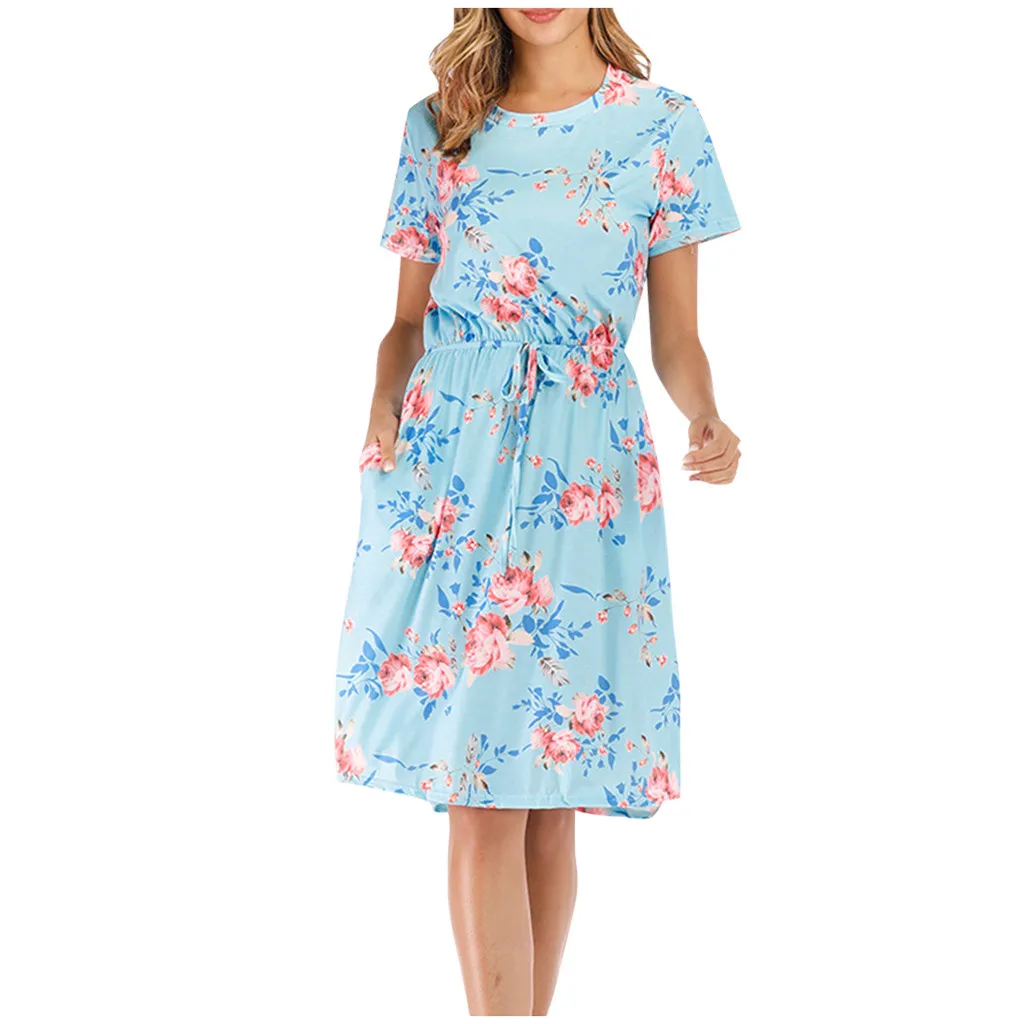 3. Круглый вырез, 3/4Рукав, до середины голениДлина, передняя молния, Узор в горошек и цветочный принт в стиле пэчворк с поясом. Милый и милый, простой, но модный.