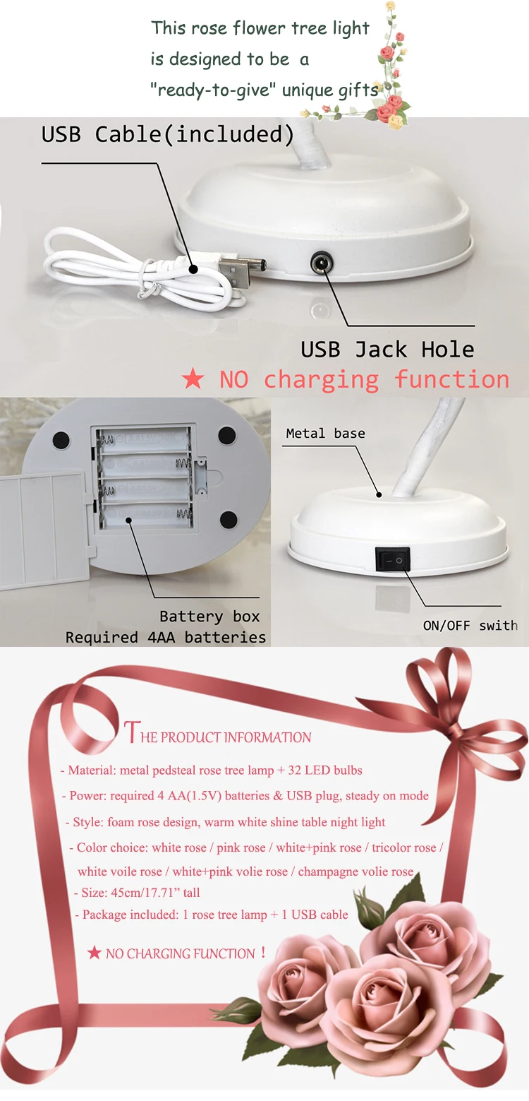 Материал: Металлический Пьедестал + светодиодный светильник + цветы из пены Цвет: как на картинке Светильник; Цвет: теплый белый Размеры: 15 см * 11,5 см * 45 см Питание: usb-разъем в DC 5V + Батарея батарейки AA 4 шт. 1,5 V (не входит в комплект)