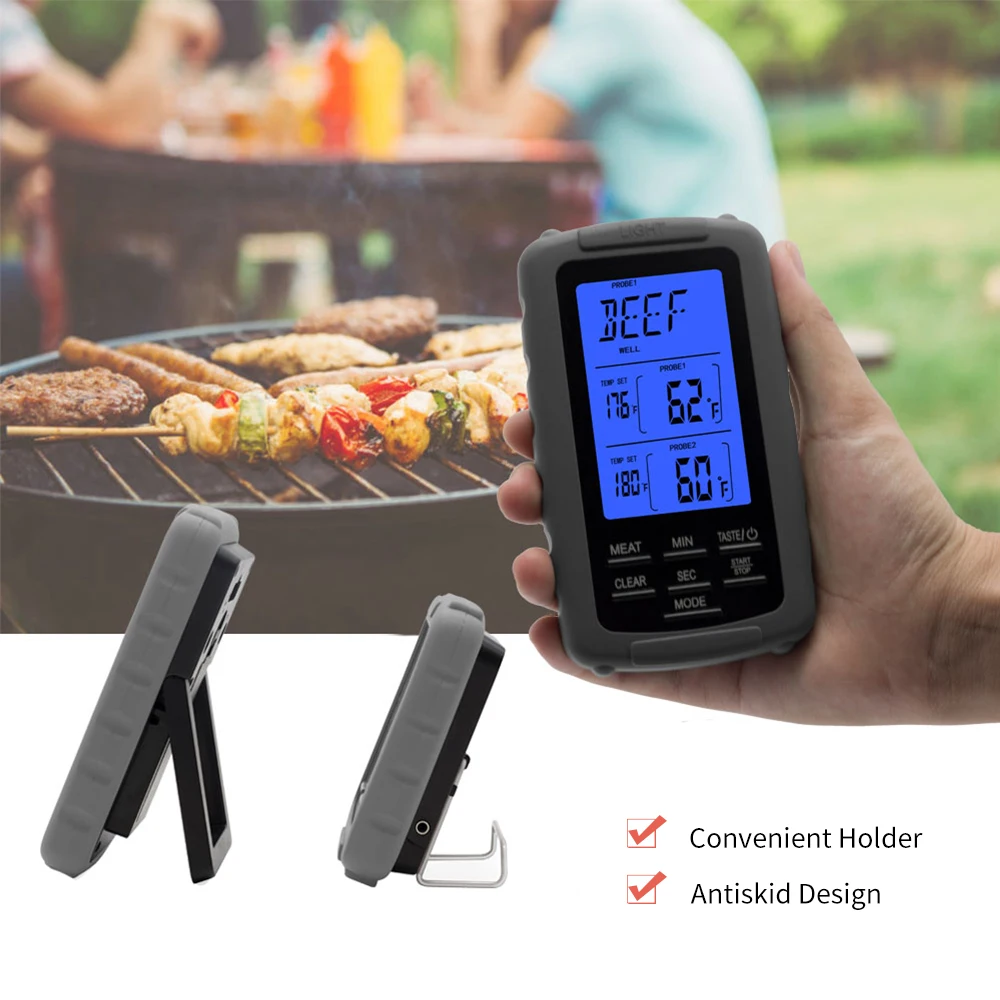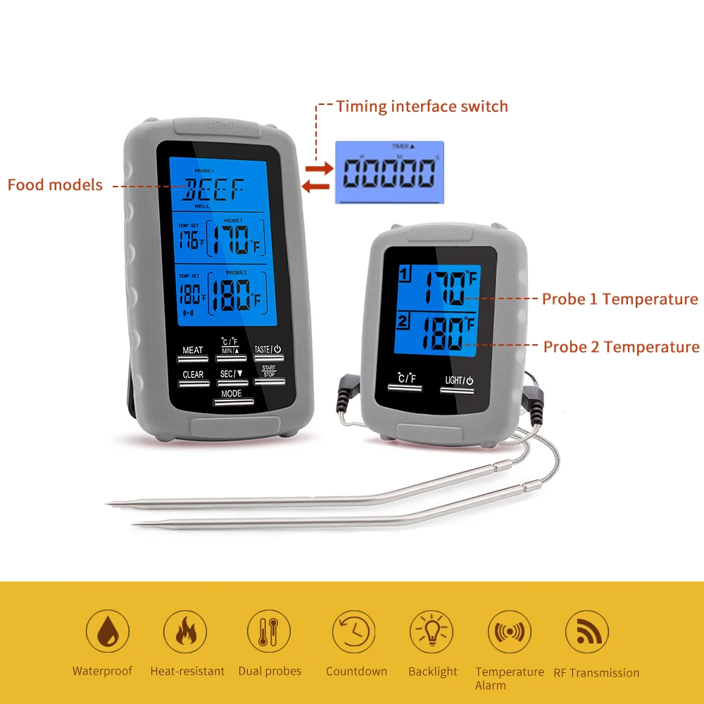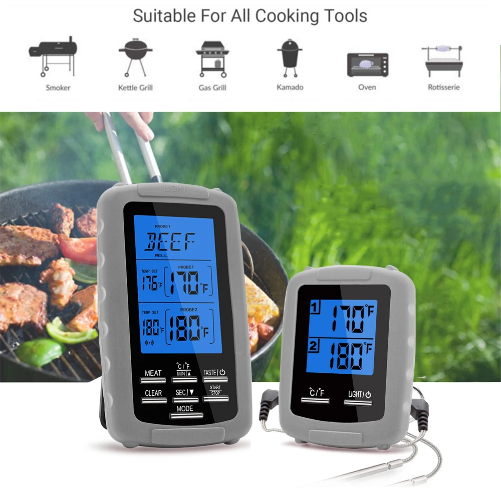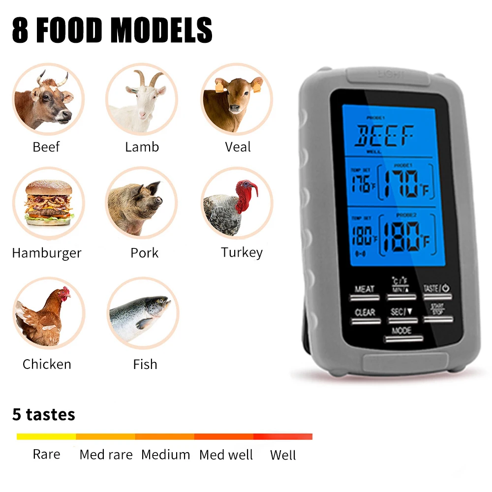 Беспроводной термометр для мяса с двойным зондом может контролировать два предмета одновременно. Зонд из нержавеющей стали полностью обновлен до водонепроницаемого и высокотемпературного сопротивления. Термометр для барбекю имеет 8 модели продуктов питания и 5 вкусов на выбор. ЖК-дисплей с подсветкой показывает точную температуру в условиях низкой освещенности.