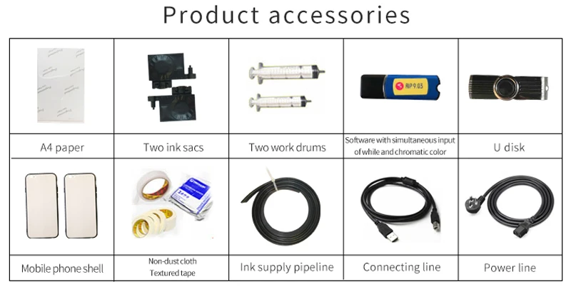 Один комплект УФ-принтера формата A4 Один кусок программного обеспечения RIP версии 9,0 Бесплатная поддержка белых и цветных УФ-чернил печать один проход Компакт-диск или U-диск (включая руководство пользователя, операционное видео, драйвер для машины и драйвер для RIP softare) Usb-кабель и кабель питания Система для заправки УФ-чернил, демпфер пустых чернил СНПЧ УФ-чернила 500 мл на цвет (BK C M Y W каждый 500 мл) и 500 мл чистой жидкости
