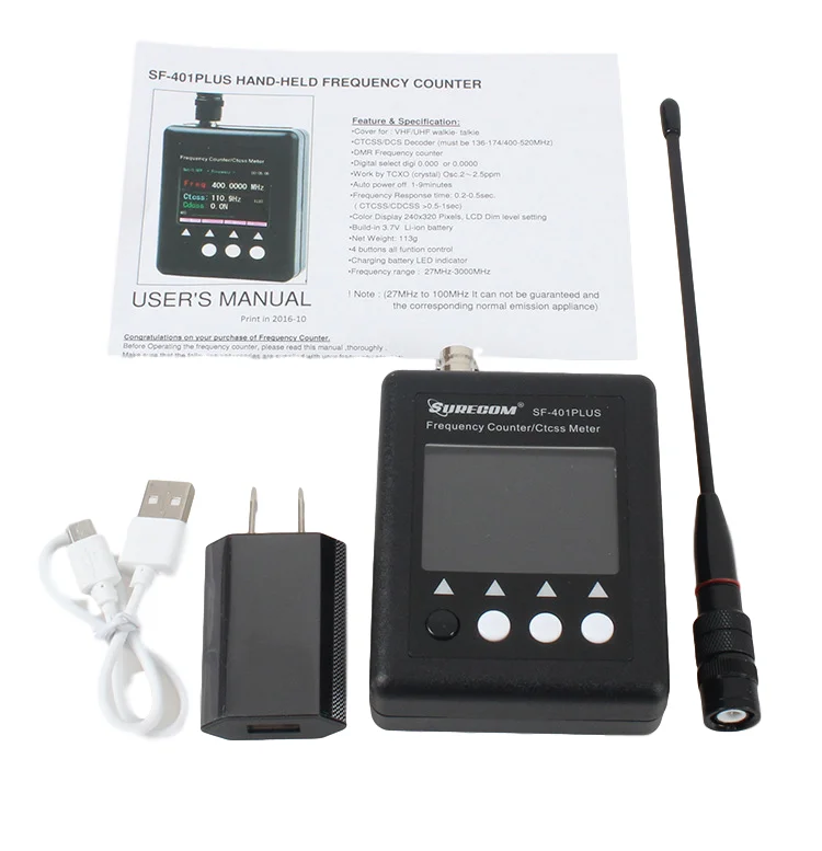 1x SF401 плюс счетчик частоты 1 х UHF Антенна 1x Руководство пользователя на английском языке 1x USB Кабель зарядного устройства 1x USB адаптер переменного тока 100-240 В