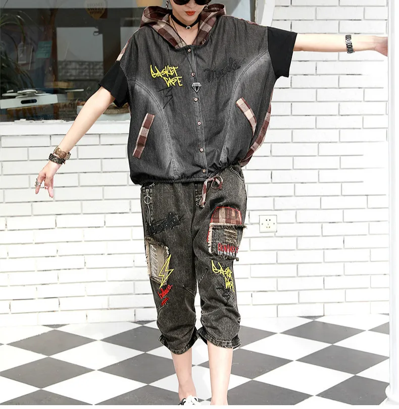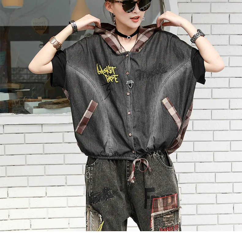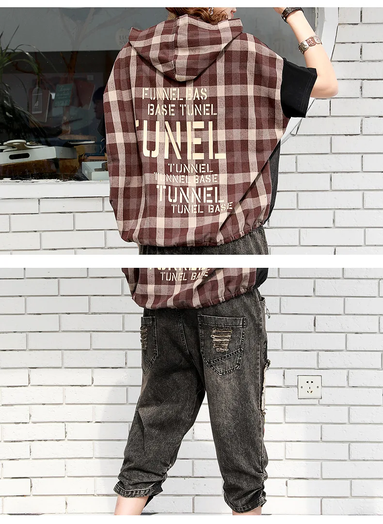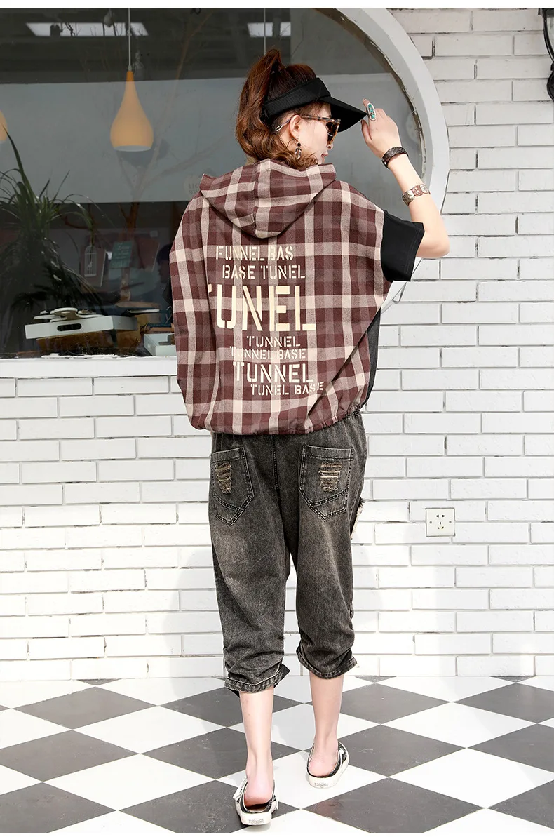Летние Модные Винтажные джинсовые костюмы в клетку с капюшоном