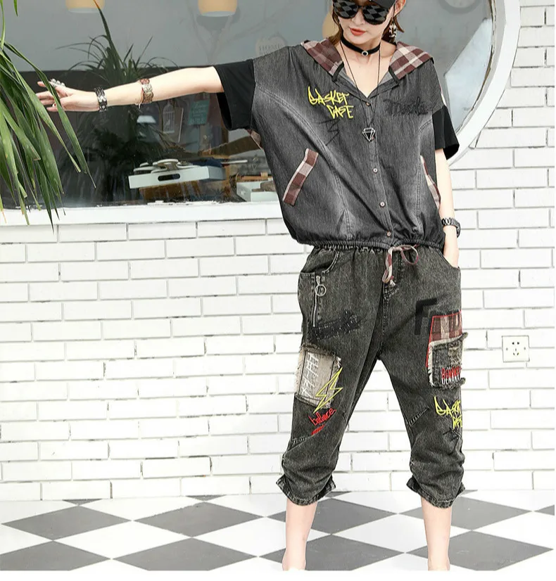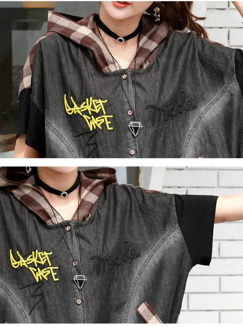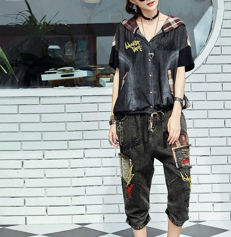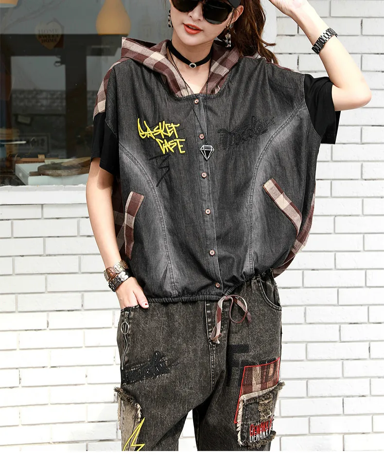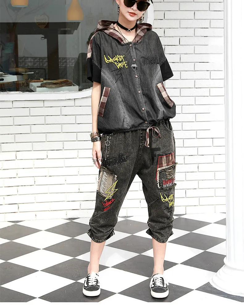 Летние Модные Винтажные джинсовые костюмы в клетку с капюшоном