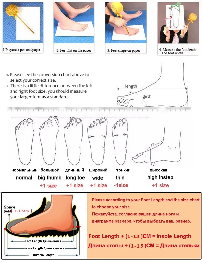 1. Пожалуйста, выбирайте размер в соответствии с длиной Вашей стопы. 2. Если фактическая длина вашей стопы 23 см, размер обуви 5 подходит для вас.