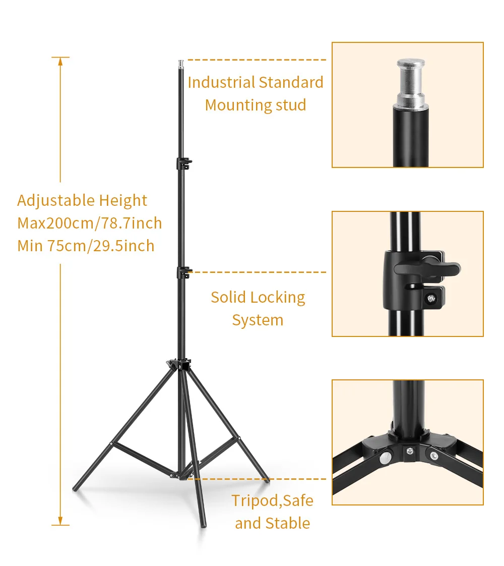 Light stand:Folded height 27inch(68cm), working height 79inch(200cm).High quality,stable and durable,easy to install and use.