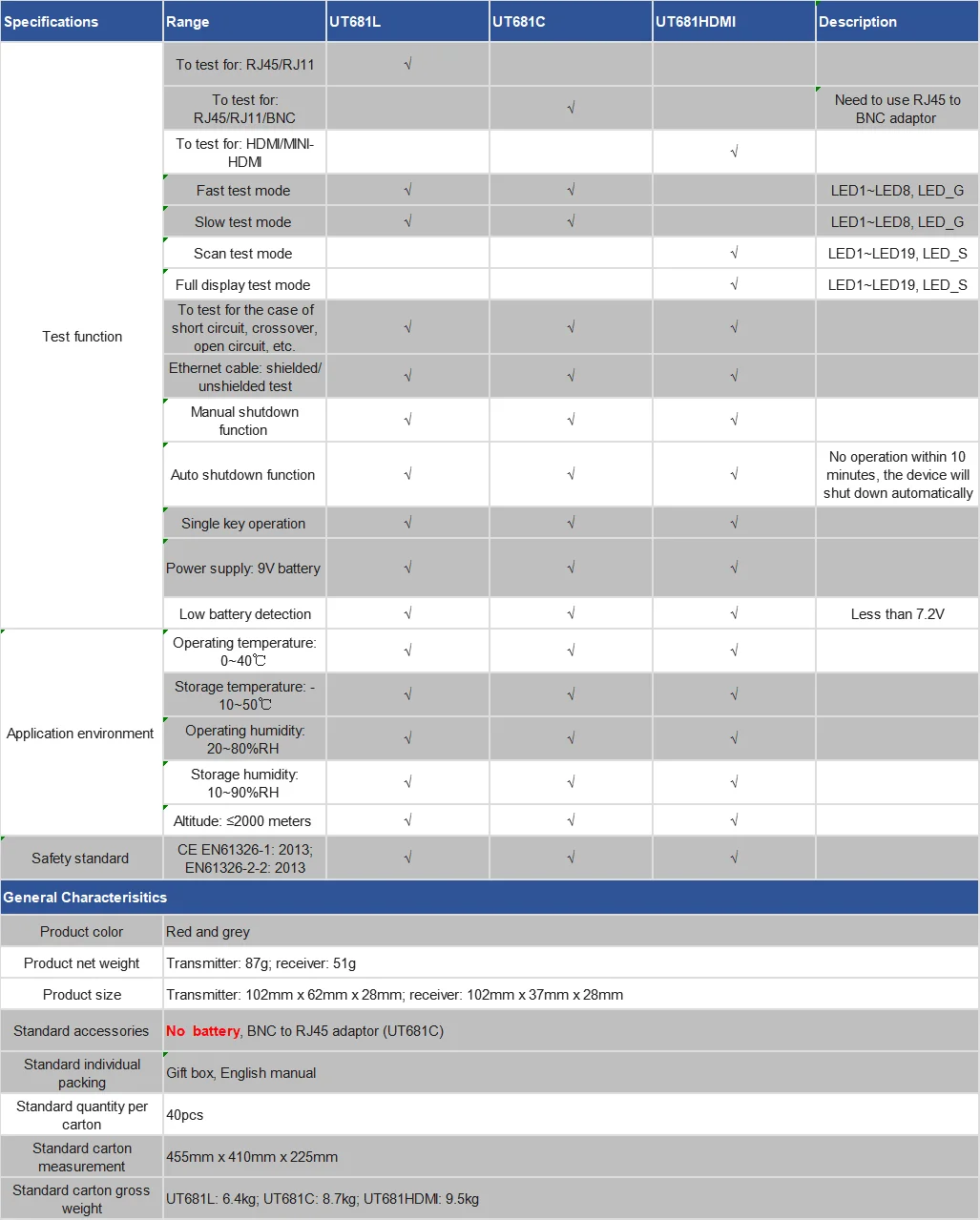 Портативный кабельный тестер серии UT681 может использоваться для быстрой проверки проводящих кабелей Ethernet/telephone/BNC/HDMI, короткого замыкания, пересечения или открытого замыкания. Они являются идеальными инструментами для технических специалистов для установки, обслуживания и проверки системы недельного тока.