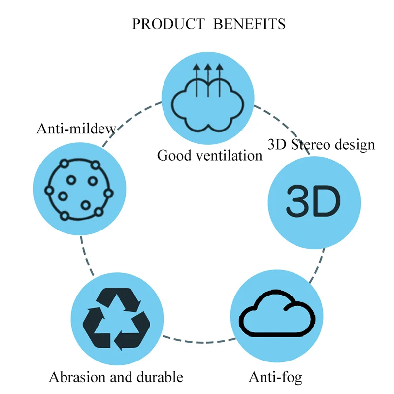 1. Эта маска представляет собой двухслойную 3D дышащую сетчатую ткань с сильным комфортом.