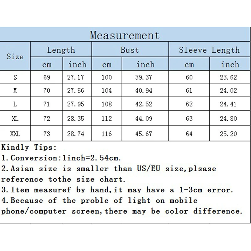 1. Пожалуйста, внимательно сверьтесь с таблицей размеров перед покупкой товара. Если вы не знаете, как выбрать размер, пожалуйста, свяжитесь с нашей службой поддержки клиентов. 2. Замеры сделаны вручную, поэтому возможны отклонения в 2-3 см. (1 см = 0,39 дюйма, 1 дюйм = 2,54 см) 3. Выберите больший размер, если ваш размер между двумя размерами. О цвете: Как вы знаете, разные компьютеры отображают цвета по-разному, Цвет товара может немного отличаться от изображения.