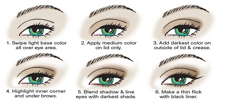 1. Светодиодный светильник со всей областью вокруг глаз. 2. Нанесите только средний цвет на крышку. 3. Добавьте Самый темный цвет снаружи крышки и складки. 4. Выделите внутренний угол и под бровями. 5. Смешать с самым темным оттенком. 6. Сделайте тонкий щелчок с черной подкладкой.