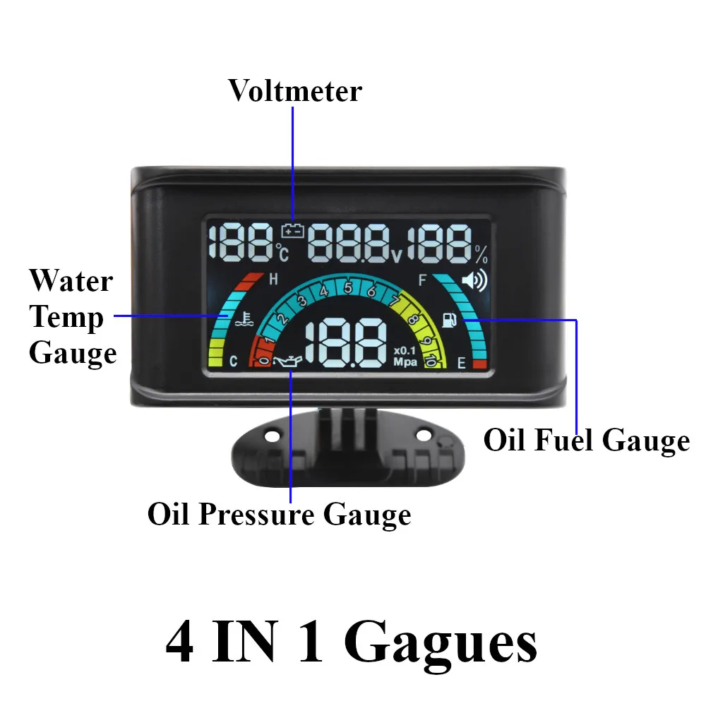 -Название: Автомобильный ЖК-датчик 4 в 1 (датчик температуры воды/давления масла/топлива/напряжения) -Рабочее напряжение: DC9V-36V, -Материал: пластиковый корпус -Размер продукта: 53 мм * 96 мм * 20 мм -Диапазон измерений: 0-100 ℃, DC9V-DC35V, 0-1. Омпа. -Сигнализация температуры воды: температура воды> 100C (scintillation + buzzer alarm) -Сигнализация напряжения: ниже 11 В, 16 В ~ 19 в, выше 30 В (scintillation + buzzer alarm) -Сигнализация давления масла: менее 0,1 МПа, 0,7 МПа ~ 1 МПа (скинтиляция + звуковой сигнал) -Точность измерения: ± 1 ℃ ± 0,1 V, ± 0.01Mpa, -Температура рабочей среды: -40 ℃ ~ 75 ℃ -Рабочая влажность окружающей среды: 45%-75% RH