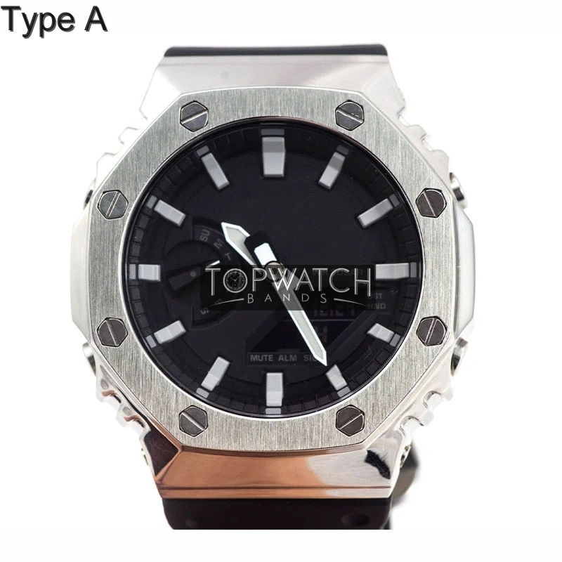 РемешокОбодокУниверсальный, любой тип может быть применен к ga-2100. Разница между ободком заключается в том, что дизайн поверхности отличается, один с буквами, один безБуквы. Разница между ремешком для часов-это передняя конструкция с отверстиями, задняя БЫСТРОРАЗЪЕМНАЯ пружинная планка отличается, но также используется для ga-2100. Если вы купите один комплект, он будет включать в себя множество инструментов для установки.