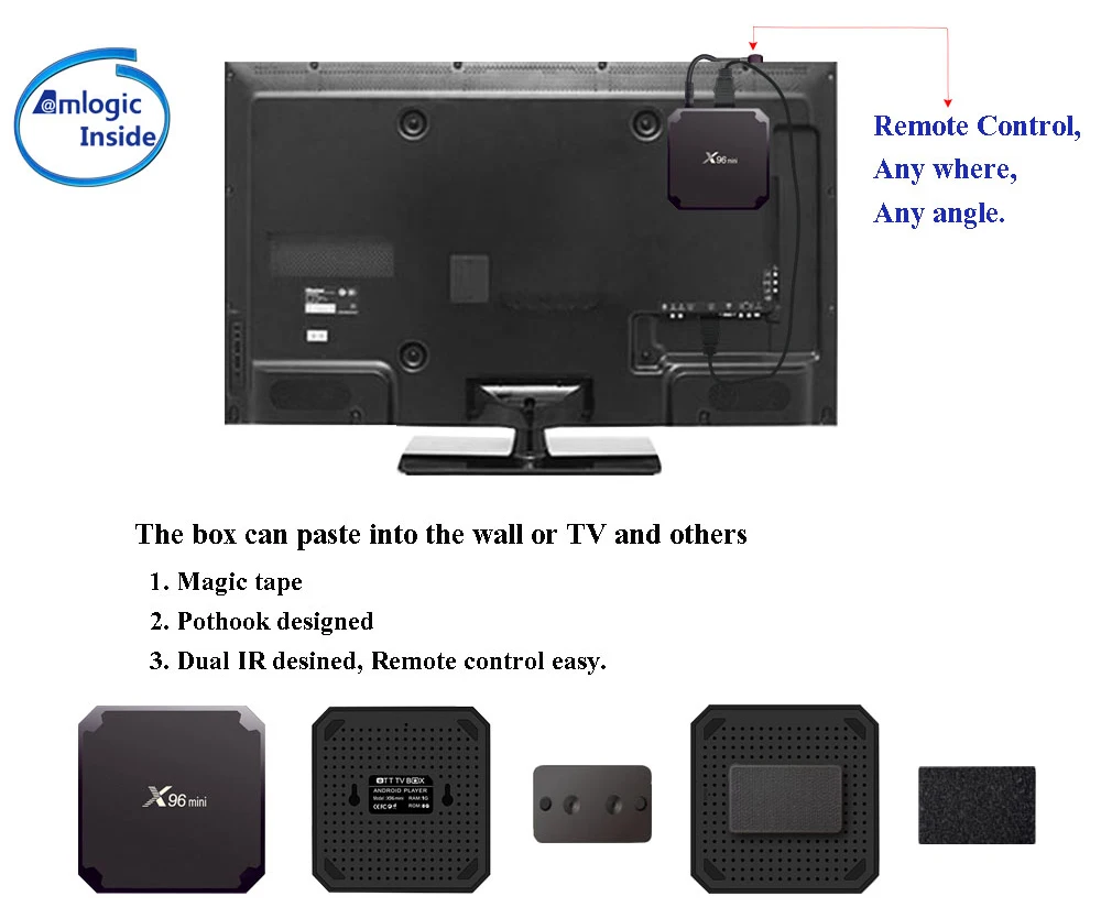 X96 mini разработан тщательно, просто купите дополнительную волшебную ленту и ИК-кабель, затем он может легко вставить в стену или телевизор и другие.