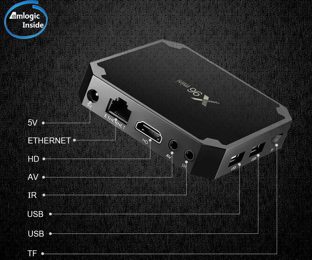 X96 mini оснащен полным набором удлинительных портов, он имеет порт питания (5 В), порт RJ45 (ETHERNET), порт HDMI (HD), av-порт (AV) и ИК-порт (IR) на задней стороне, и два usb-порта и порт tf-карты (TF) слева.