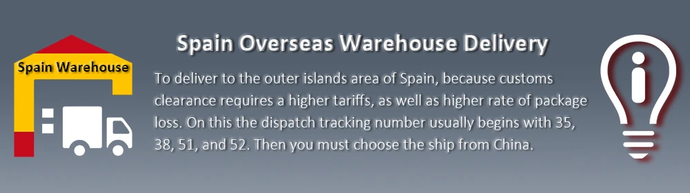 Для доставки на Внешние острова Испании, потому что таможенное оформление требует более высоких тарифов, а также более высокой скорости потери посылка. При этом номер отслеживания отправки обычно начинается с 35, 38, 51 и 52. Затем вы должны выбрать доставку из Китая. Для доставки на Внешние острова Португалии, если номер отслеживания отправки начинается с 9000 - 9999, то он поддерживает только доставку из Китая.