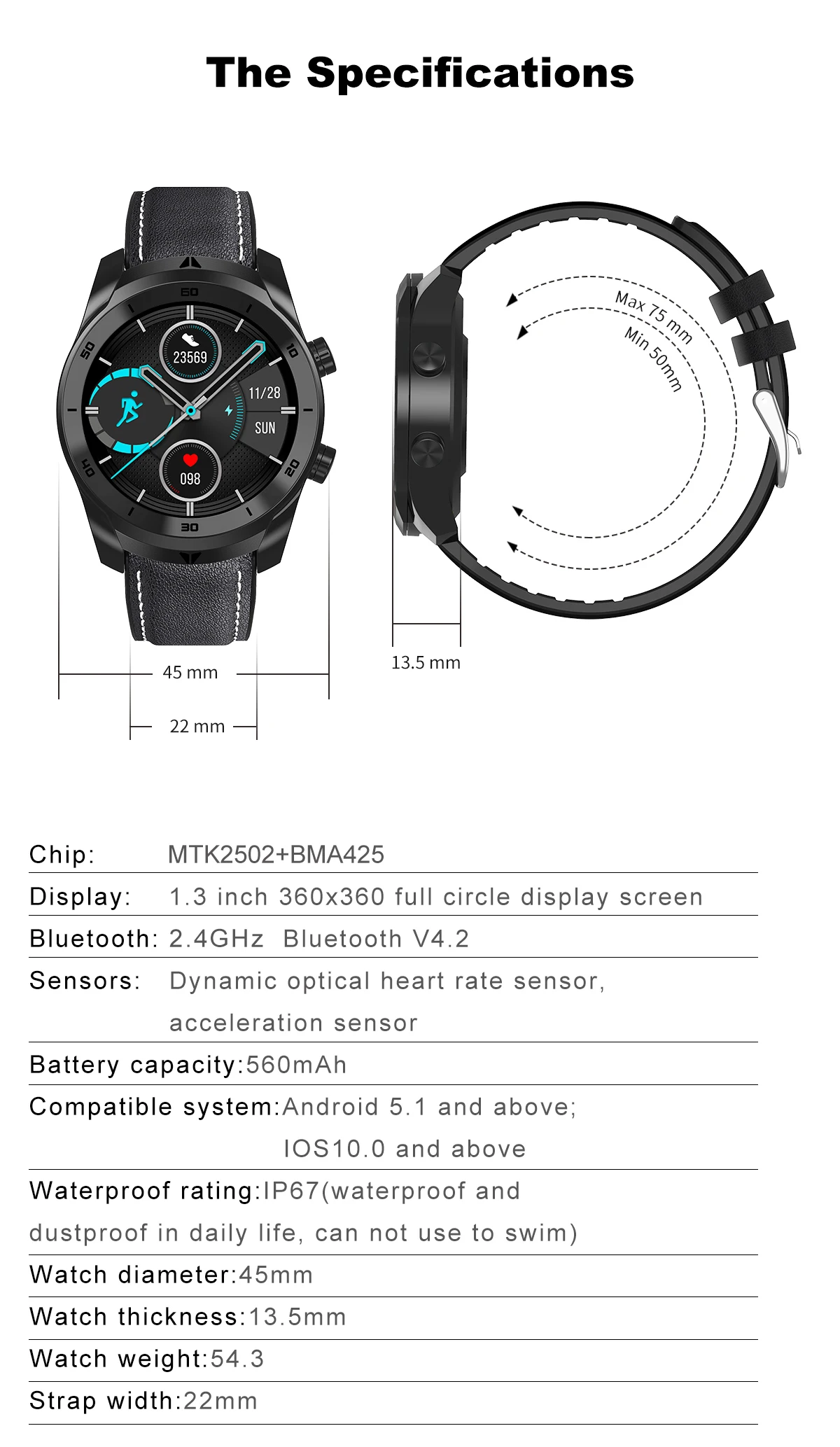 Чип: MTK 2502C RAM: встроенный (cpu):RAM:32MB ROM32MB Расширенный SPI:128MB Размер экрана: 1,3 круглый экран Разрешение экрана: 360*360 Тип экрана: LTPS ЖК-экран Материал экрана: закаленное стекло Емкость аккумулятора: 560 мАч