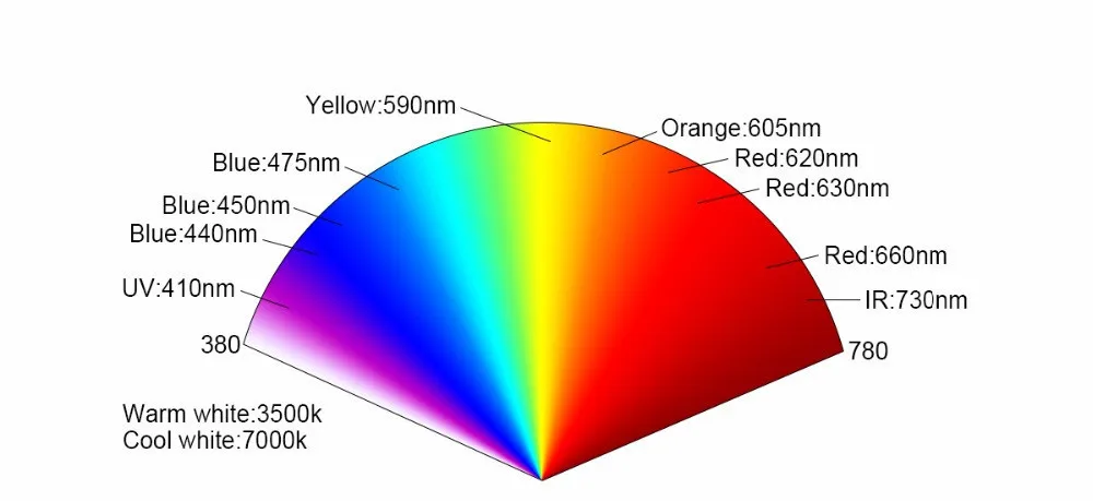 Полный спектр для вегетативной и цветущей стадии: 430 ~ 440nm, 450 ~ 475nm, 620 ~ 630nm, 650 ~ 670nm, белый, IR(730nm)