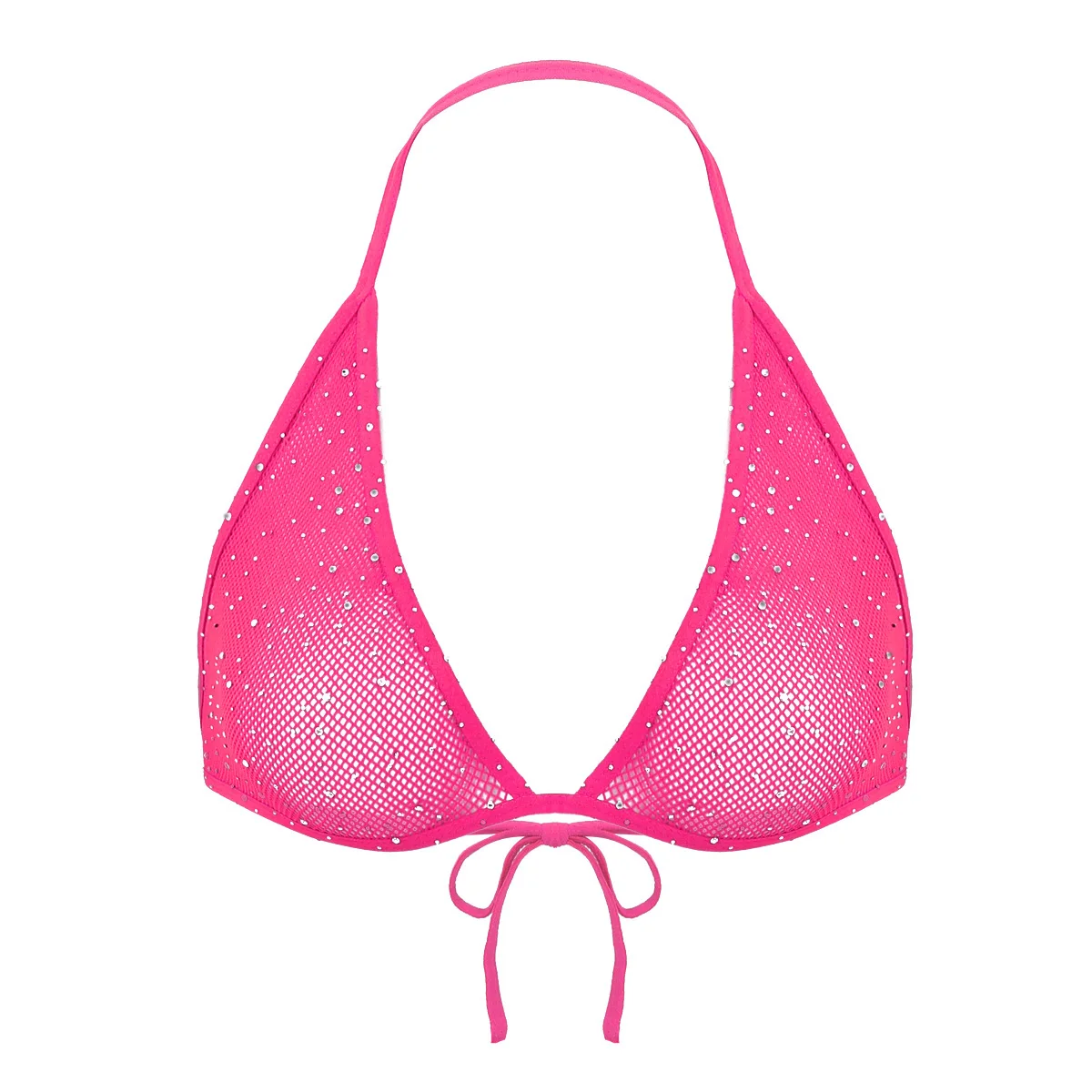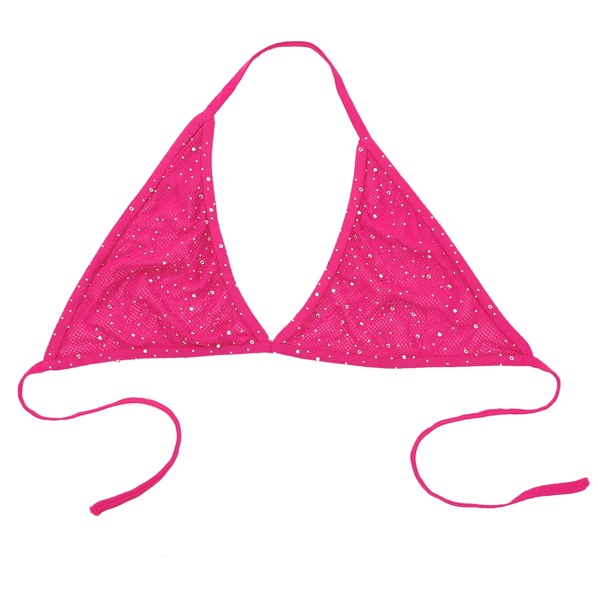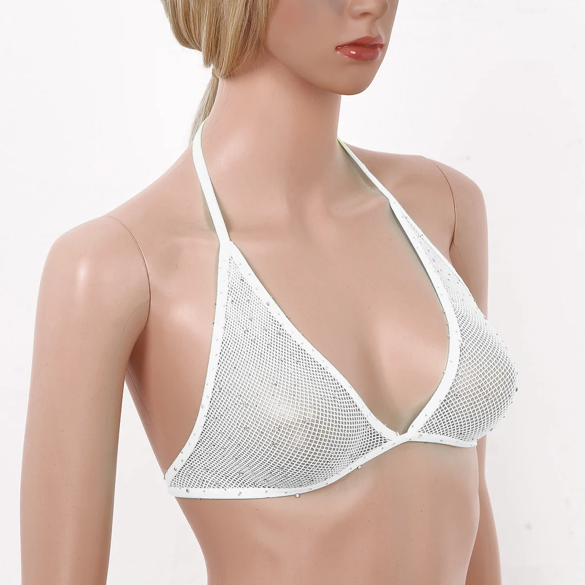 Воротник-халтер с завязкой на тонких бретелях сзади, ажурные треугольные чашки с дизайном, с блестящими Стразы по всему.