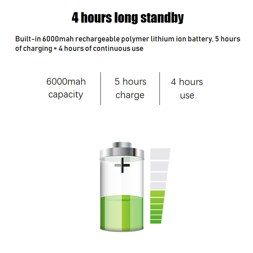 Встроенный перезаряжаемый литиевый аккумулятор емкостью 6000 мАч, полностью заряжен в течение 4 часов непрерывного использования при максимальной яркости экрана.