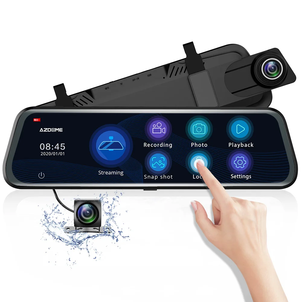 AZDOME PG12 10 "зеркальный видеорегистратор, потоковая передача данных, Полноэкранный сенсорный двойной объектив, ночное видение 1080P, фронтальная камера 720P, резервный Автомобильный видеорегистратор