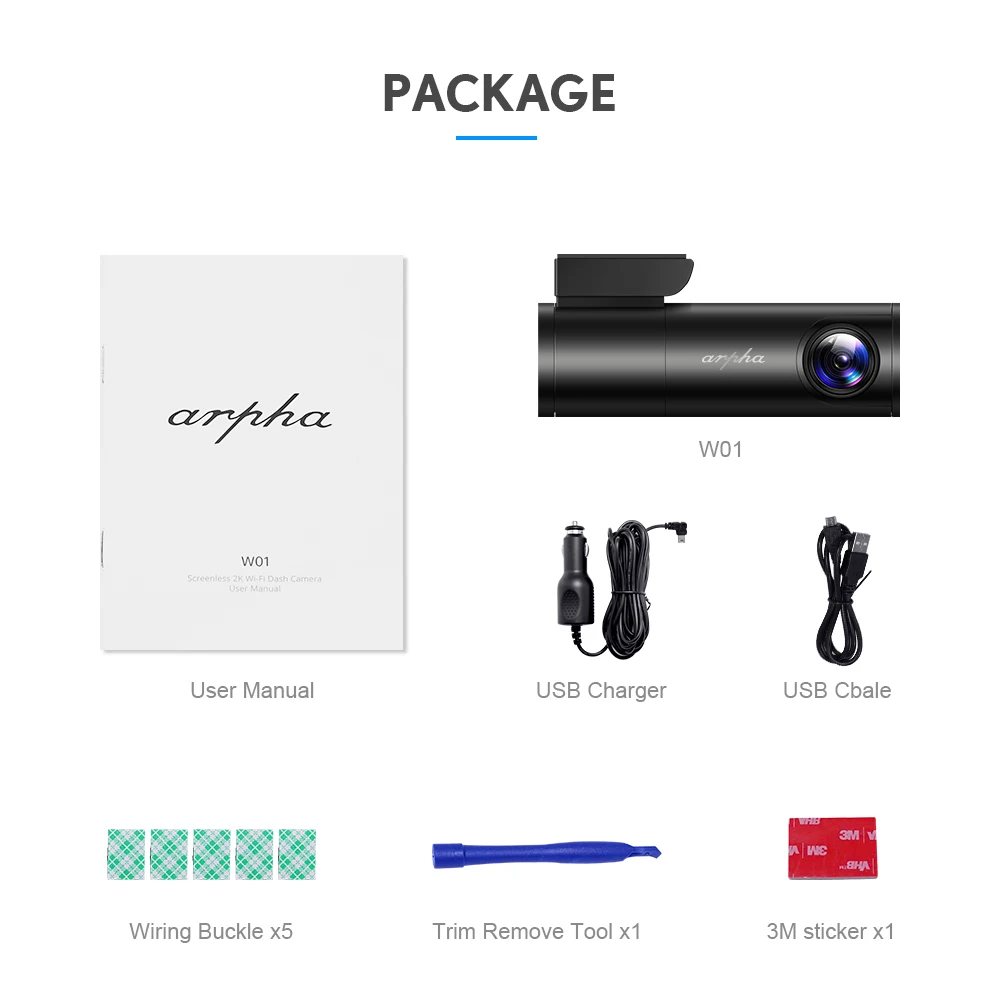 -1 x Dash камера W01 -2 x Электростатическая прозрачная пленка -1 xcar зарядное устройство -1 x usb-кабель -Руководство 1 xuser -2 x 3М наклейка -5 x кабельных зажимов и 1xPry инструмент