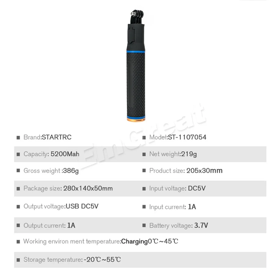 Бренд: startrc Модель: st-1107054 Ёмкость: 5200 мА-ч Вес нетто: 219 г Вес брутто: 386 г Размер продукта: 205x30mm Посылка Размеры: 280x140x50mm Вход напряжение: dc5v Выходное напряжение: usb dc5v Вход ток: 1a Выход ток: 1a Батарея напряжение: 3,7 v Рабочая среда Температура: аккумуляторная 0 ℃ ~ 45 ℃ Температура хранения: -20 ℃ ~ 55 ℃