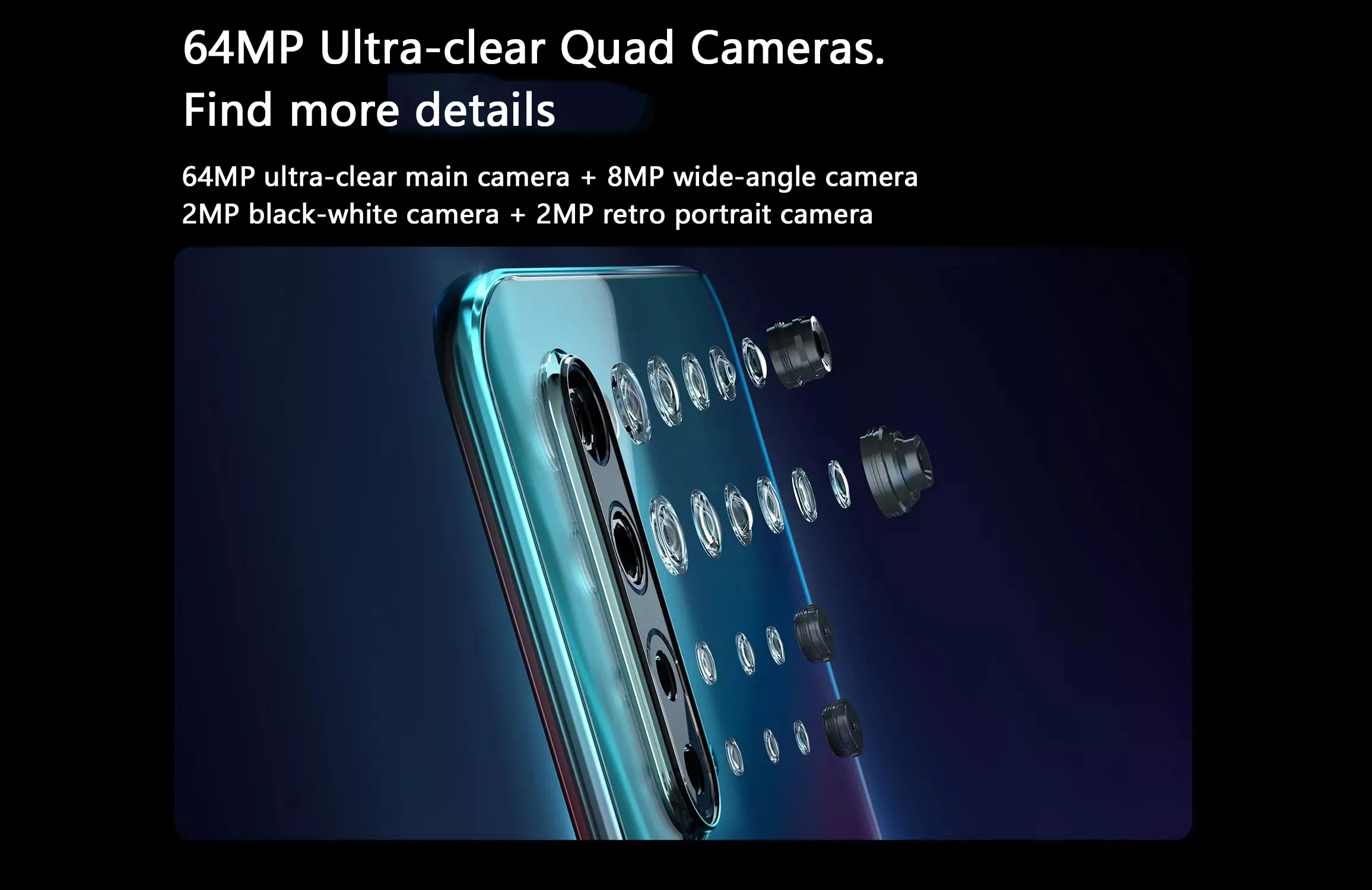 Сзади: 64 мп + 8 Мп + 2 Мп + 2 МП спереди: 32 МП