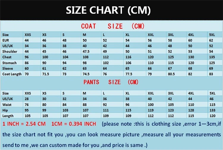 Пожалуйста, отправьте мне свои мерки 1. Вырез = _____ дюймов/______ см; 2. Плечо = _____ дюймов/______ см; 3. Длина рукава = _____ дюймов/______ см; 4. Пройма = _____ дюймов/______ см; 5. Запястье = _____ дюймов/______ см; 6. Грудь = _____ дюймов/______ см; 7. Живот = _____ дюймов/______ см; 8. Талия = _____ дюймов/______ см; 9. Обхват бедер = _____ дюймов/______ см; 10. Длина куртки = _____ дюймов/_____ см; 11. Длина брюк = _____ дюймов/______ см; 12. Бедро = _____ дюймов/______ см; 13. Высота = _____ дюймов/______ см; 14. Вес = _____ дюймов/______ см;