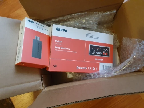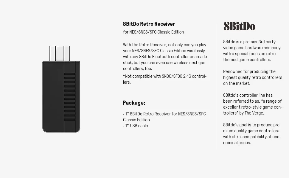 Legit 8BitDo store, the products were well packed. Bought this to pair it with an "8BitDo N30 Bluetooth Gamepad for Nintendo Switch Online" and use them on a NES Classic Edition. Both products work well with NES Classic Edition, also before purchasing I've talked with the nice people from tech support on their official website and confirmed that it will work. The product package contains the receiver and a small charging cable. Bottom line I recommend this store and their well praised products by reviewers all over the internet.
