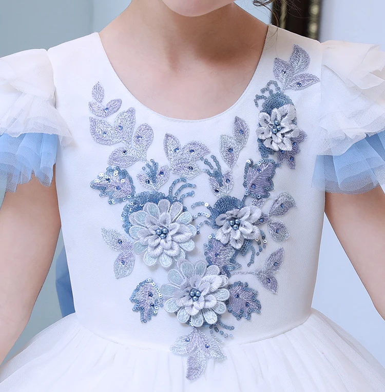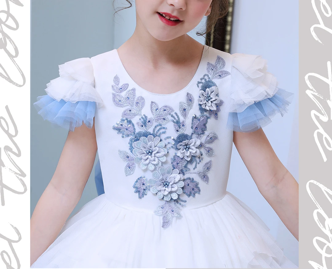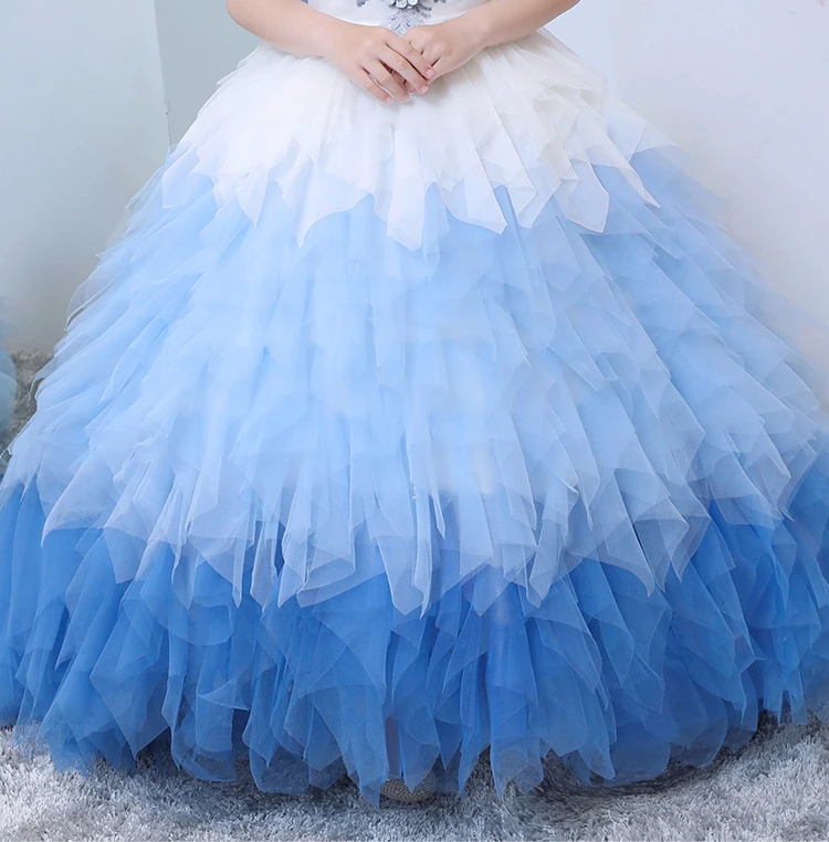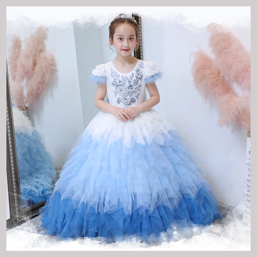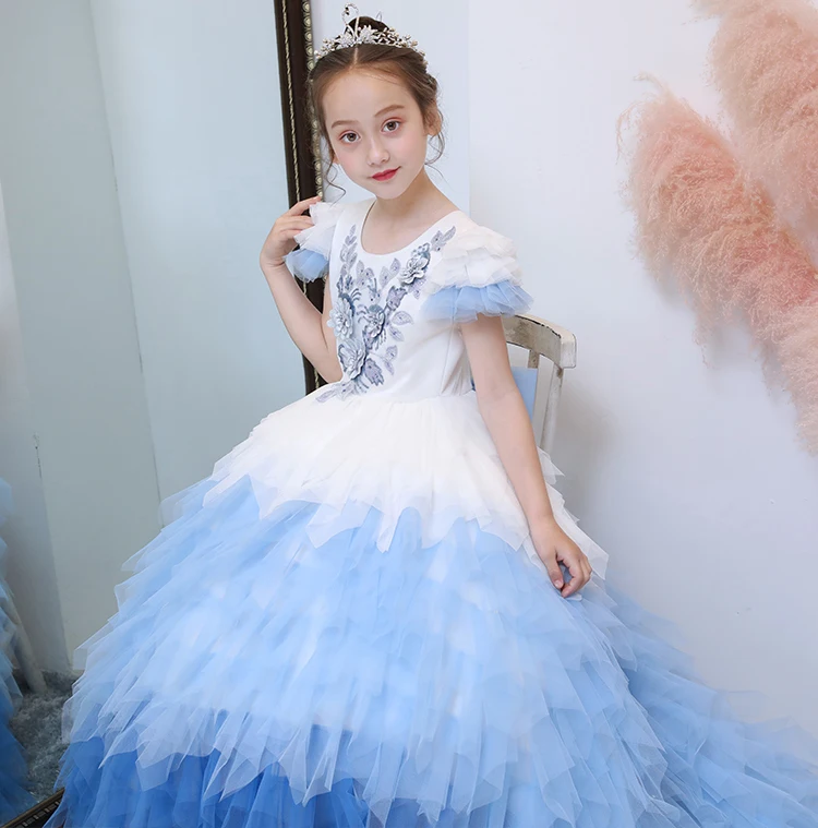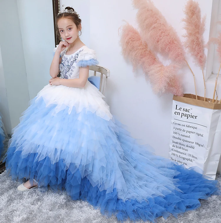 Роскошное голубое платье с градиентом и длинным шлейфом для детей платье для девочек с Т-образным подолом для сцены Красивое Праздничное Платье