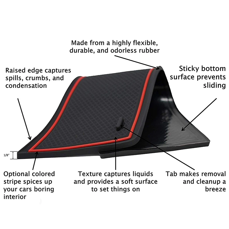 Подходящие вкладыши похожи на миниатюрные «коврики», которые покрывают почти все карманы вашего автомобиля, в том числе: подстаканники, дверные карманы и центральная консоль. Они обеспечивают защиту от мелких разливов, крошек, расплавленных конфет, царапин и гремящих монет.