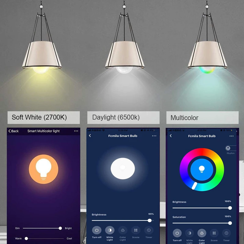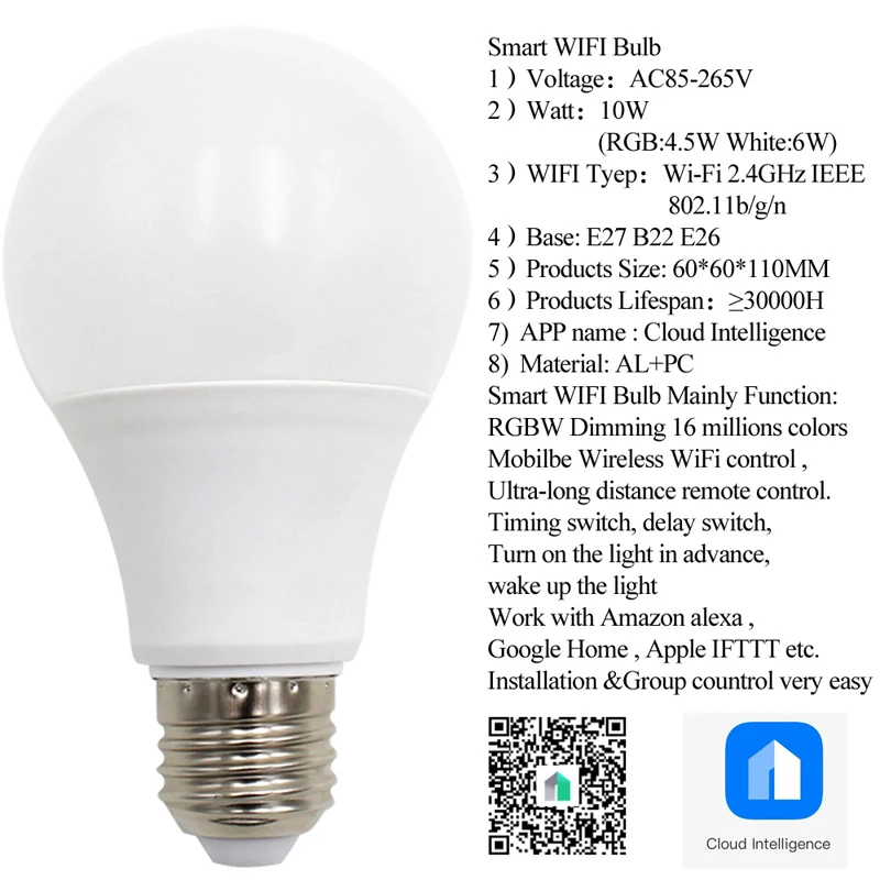 Параметры: 1) Входное напряжение: AC85-265V 2) мощность: 10 Вт RGB + Вт 3) Тип беспроводной связи: Wi-Fi 2,4 ГГц 4) Стандарт беспроводной связи: IEEE 802.11b/G/N 5) интерфейс головки лампы: E27 B22 E26 E14 6) Размер изделия: 65*105 мм 7) Цвет изделия: пластиковая покрытая алюминием 8) Срок службы: ≥ 30000 часов Функция: Bluetooth + wifi Совместим с Tmall Genie, поддерживает несколько языков, дистанционное управление мобильным приложением, таймер, затемнение и регулировку цвета 16 миллионов регулировок цвета. Групповое управление и единое управление, Совместимость с Amazon alexa, google home и app IFTTT, Tmall Джинн. Функция памяти, голосовое управление, с режимом сцены