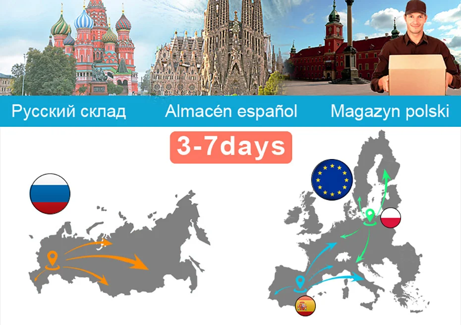 2. У нас есть склад в России, Испании, Польше, если вы покупаете товар со склада, Нет Таможенной платы, нет налогового сбора, и никаких других сборов, И вы получите посылку 3-7 дней, если нет особых условий. И Заморская цена продукта ниже, чем цена китайской продукции, поэтому выберите этот продукт склада лучший выбор для вас.