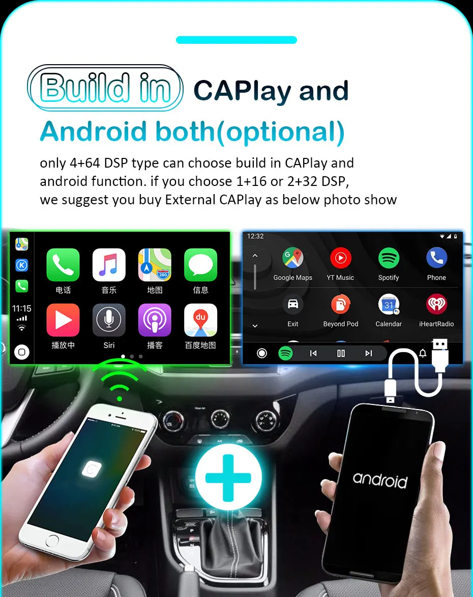 Встроенный беспроводной кабель Это радио включает в себя встроенную беспроводную функцию CAPLAY и автоматическую функцию android (опционально). Когда вы подключаете свой мобильный телефон к радио через приложение ZIINK, вы можете контролировать свой мобильный телефон с помощью нашего радио-экрана. Вы можете совершать телефонные звонки, слушать мобильный телефон и проверять мобильный телефон на радиоэкране.