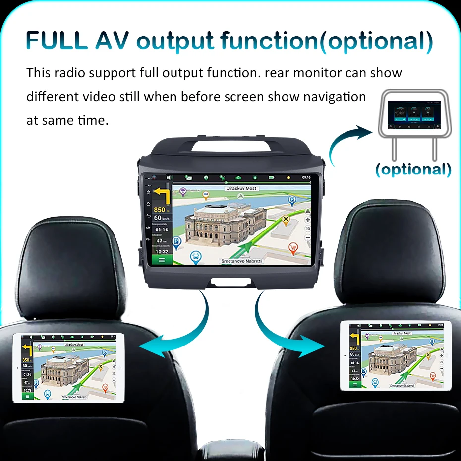 Полная функция вывода AV Это Радио имеет полную функцию выхода AV (опционально), эта функция принесет много удовольствия детям и вашей семье, которые находятся на заднем сиденье в долгом путешествии. Они могут смотреть телевизор, фильмы, мультфильмы, видео на Youtube, мВ и другие видео. На рынке большинство торговых радиостанций не имеют функции выхода AV.