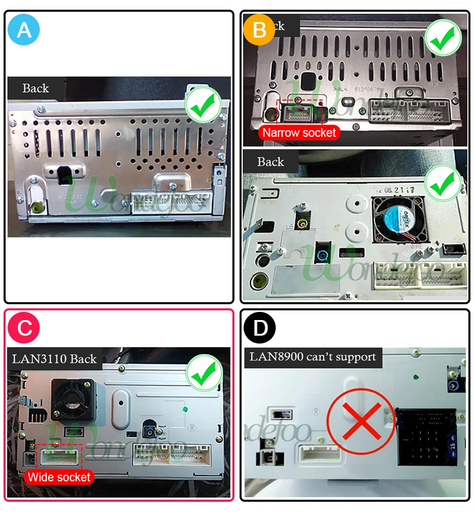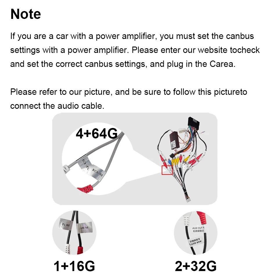 Если вы автомобиль с усилителем мощности, вы должны установить настройки canbus с усилителем мощности. Пожалуйста, введите наш веб-сайт, чтобы проверить и установить правильные настройки canbus, и подключите к области. Пожалуйста, обратитесь к нашему изображению и обязательно следуйте этой фотографии. Подключите аудиокабель.