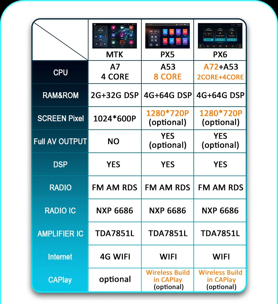 PX6 PX6 является лучшим чипом на рынке в настоящее время, он работает быстрее, чем все другие типы. Балл ANTUTU составляет 160770, что лучше 9853 4G + 64G, PX5 и всех других типов 4 + 64G на рынке. По сравнению с другими радио типа fo, PX6 radio может загружать больше видов приложений android с android market, и приложение может работать лучше.
