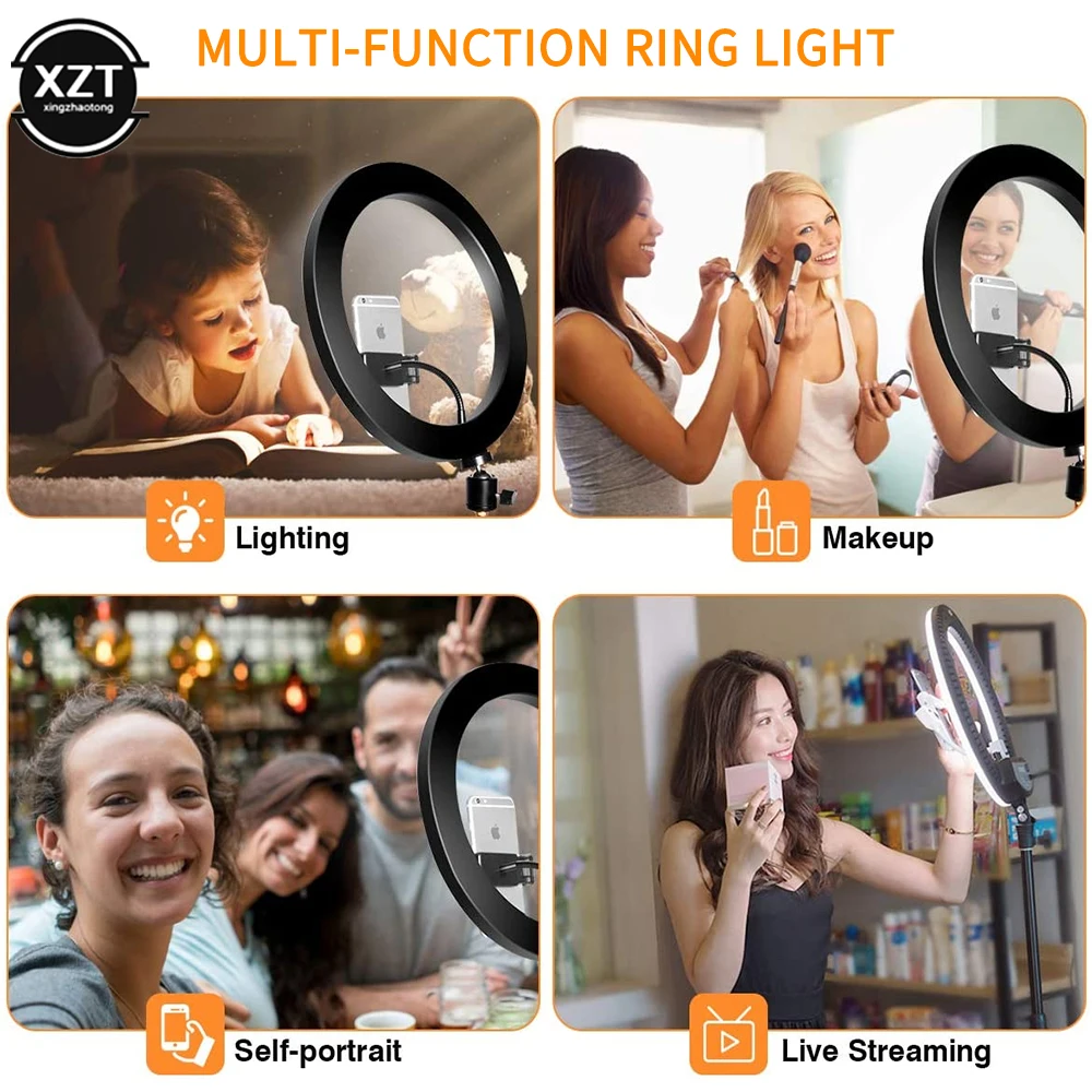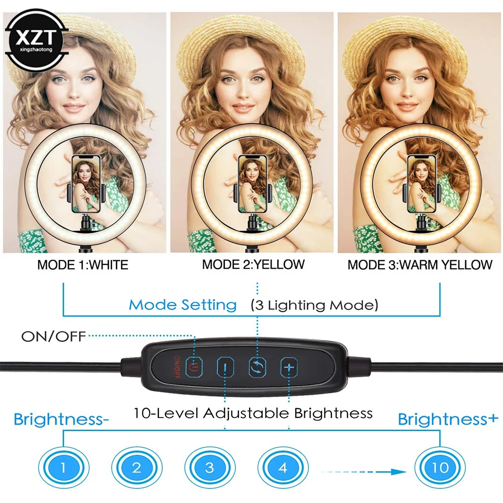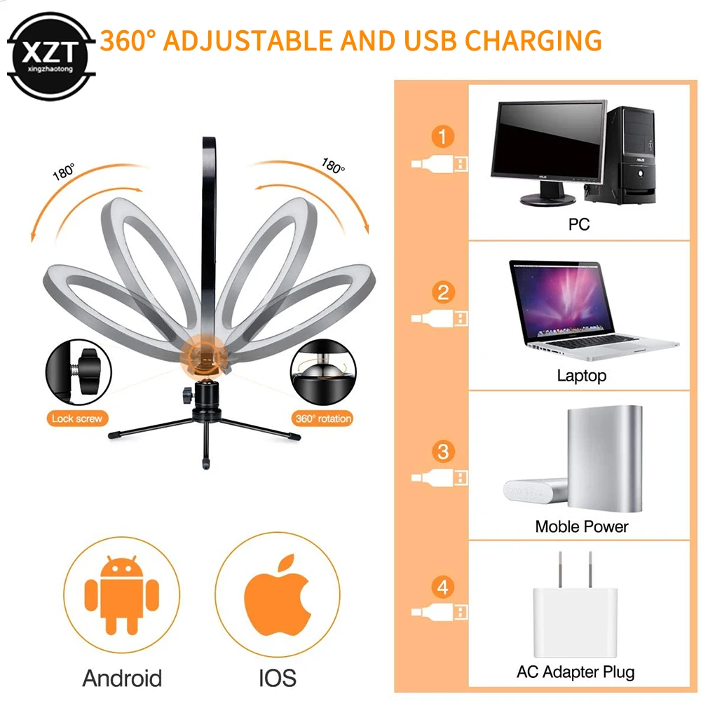 Описание: Светодиодный кольцевой светильник с регулируемой яркостью 10 дюймов с широким диапазоном затемнения от 1%-100%. Специальный светодиодный, легкий и портативный дизайн. Постоянный ток, низкое энергопотребление. Отсутствие ультрафиолетового и инфракрасного излучения светильник излучения, низкая теплоотдача, безопасность и защиту окружающей среды. Длительный срок службы более 50000 часов. С усиленной гибкой рукояткой, которая будет свободно двигаться и никогда не дрожать. Сверхдлинный шнур и сверхмощные винты для большого пальца. Широко применяется при естественном освещении под обстановку вне светильник, наполнитель светильник портретной съемке, на модных показах, свадьбах, рекламной съемке, съемке видео и т. д. Характеристики: Светодиодный светильник: 128 шт. Форма: Кольцо Внешний диаметр: 18 см/26 см Общая мощность: 12 Вт Цветовая температура: 3200K-5600K Регулировка яркости: Да Диапазон затемнения: 1%-100% Адаптер: USB Материал: алюминиевый сплав Это usb-разъем Посылка включает: 1x светодиодный кольцевой светильник 1x держатель для телефона 1x USB разъем 1 настольный мини-штатив (все металлические) Наш мини-штатив изготовлен из металла, он очень стабильный Подходит для: Для Sony для Olympus для Canon для Samsung для Panasoinc для FUJIFILM Для Nikon для Pentax для panasonic для fujifilm подходит для любого типа камеры