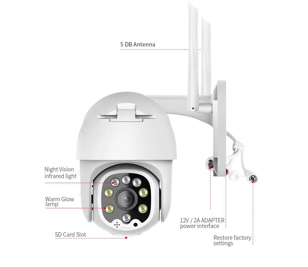 Камера имеет очень хорошее ночное качество изображения. С 4 светодиодными лампами и инфракрасным излучением в течение 24 часов, дальность ночного видения камеры до 30 м в темноте, хорошая гарантия с точки зрения предотвращения безопасности.