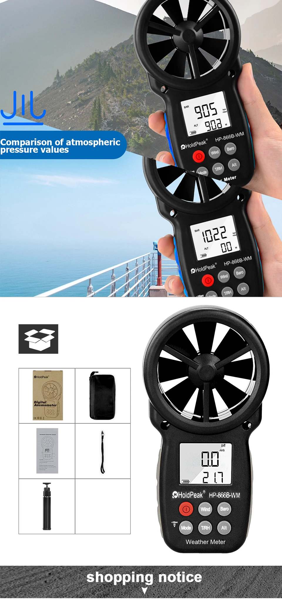 Цифровой анемометр HOLDPEAK 866B-WM, ручной измеритель скорости ветра с измерением высоты и hpa, для измерения скорости ветра, температуры (℃/℉), точки росы и охлаждения ветра с подсветкой и