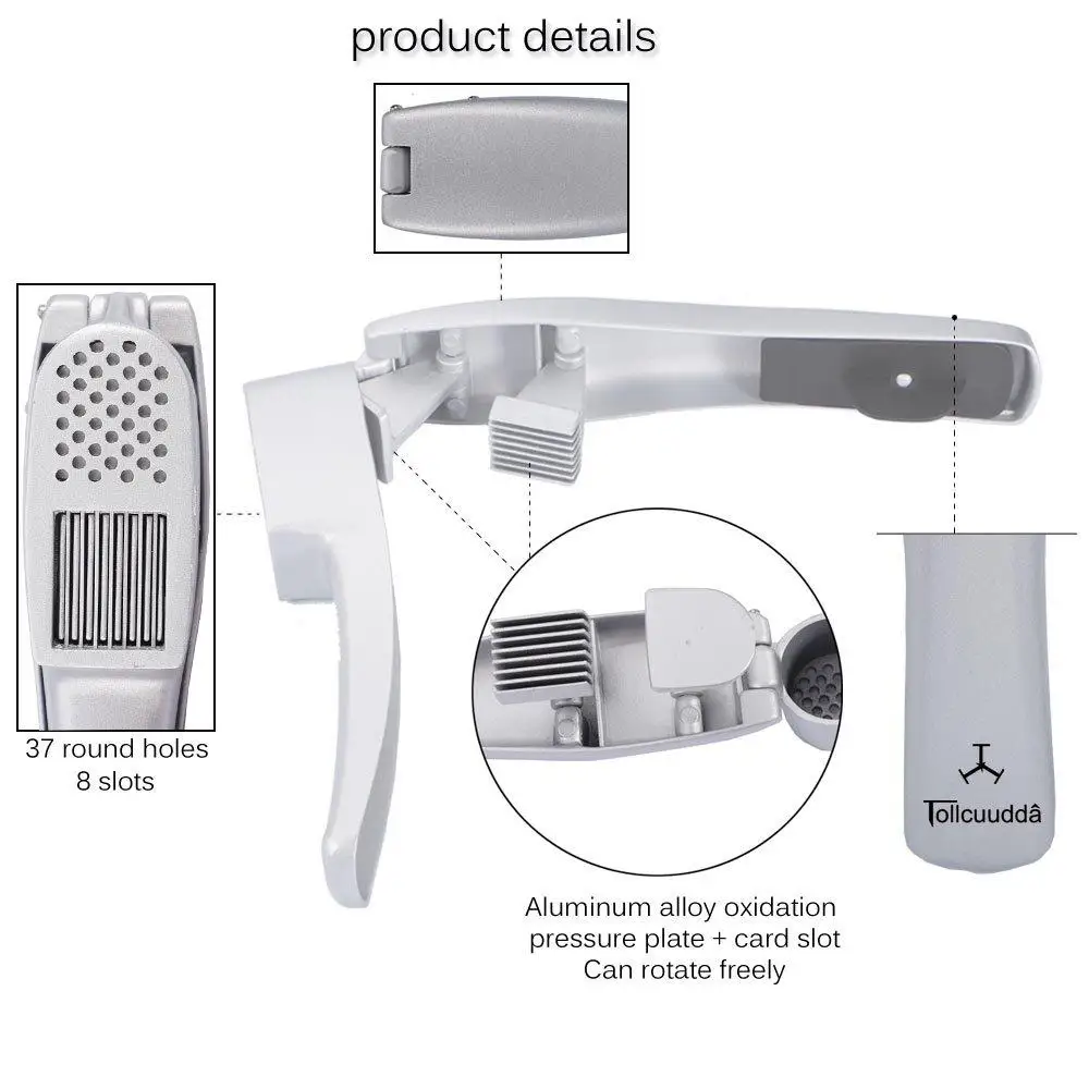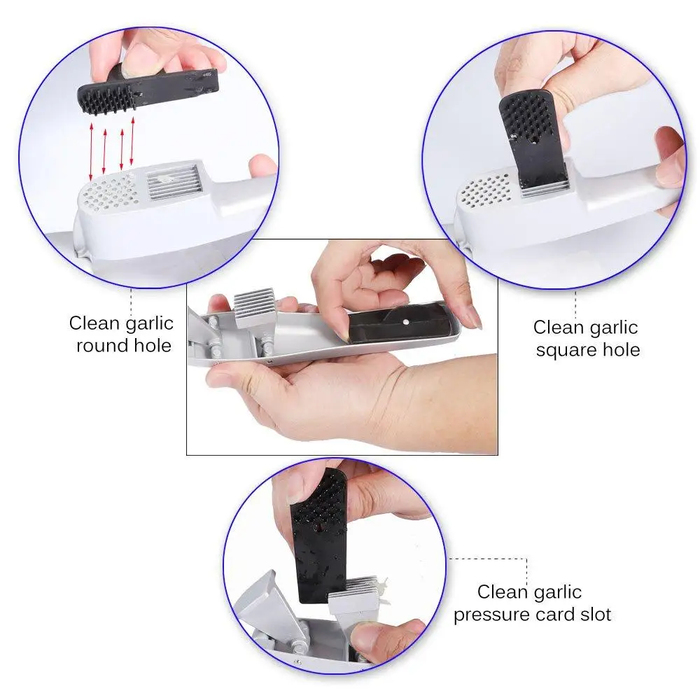 Его очень легко чистить, когда вы используете его, чтобы раздавить чеснок, вам нужно очистить его, потому что в отверстии под давлением будет немного остатка чеснока, мы установили небольшой черный внутри ручки продукта очистите пластиковую пластину, вы можете вынуть его, А затем под кран, вы можете использовать этот маленький инструмент для очистки остатка, не нужно чистить его вручную
