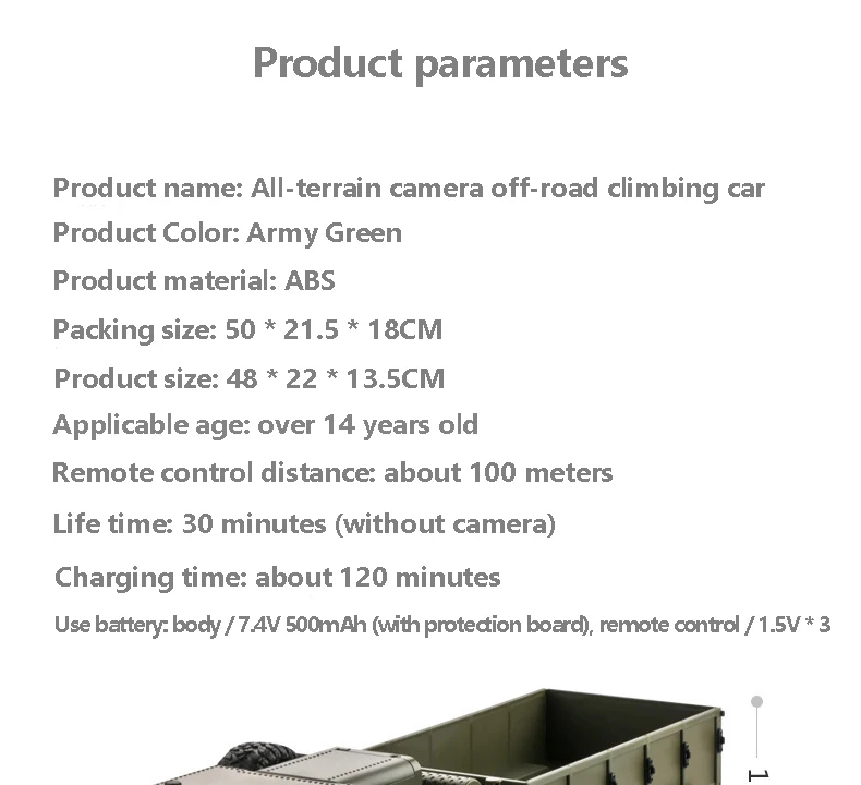 Описание: Категория продукта: RC автомобиль Цвет: армейский зеленый Режим дистанционного управления: ручка Расстояние дистанционного управления: около 55 метров Батарея дистанционного управления: AA "1,5 В × 2" (не входит в комплект) Максимальная нагрузка: 1,5 кг Время зарядки: 120 минут Срок службы: 30 минут Подходящий возраст: 7-35 лет Функция продукта Описание функции: оснащен 180 мотор, 17G рулевой механизм, 6-колесный), может открыть дверь. Упаковка: цветная коробка Пакет включает в себя: 1 * автомобиль с дистанционным управлением 1 * пульт дистанционного управления 1 * батарея для тела 1 * USB кабель для зарядки 1 * отвертка 1 * Инструкция по эксплуатации Примечание: на 1-2 мм сигнал может существовать, связанная с особенностями измерения вручную (Обратите внимание: 1 см = 0,39 дюйма), пожалуйста, отнеситесь с пониманием. Цвета могут отличаться из-за различных настроек монитора.