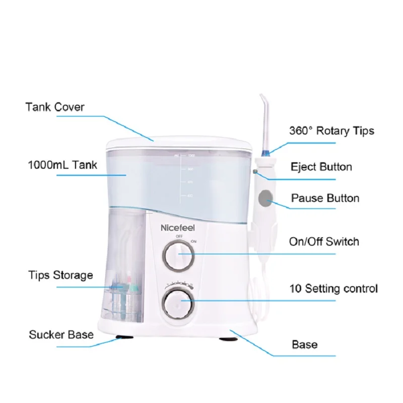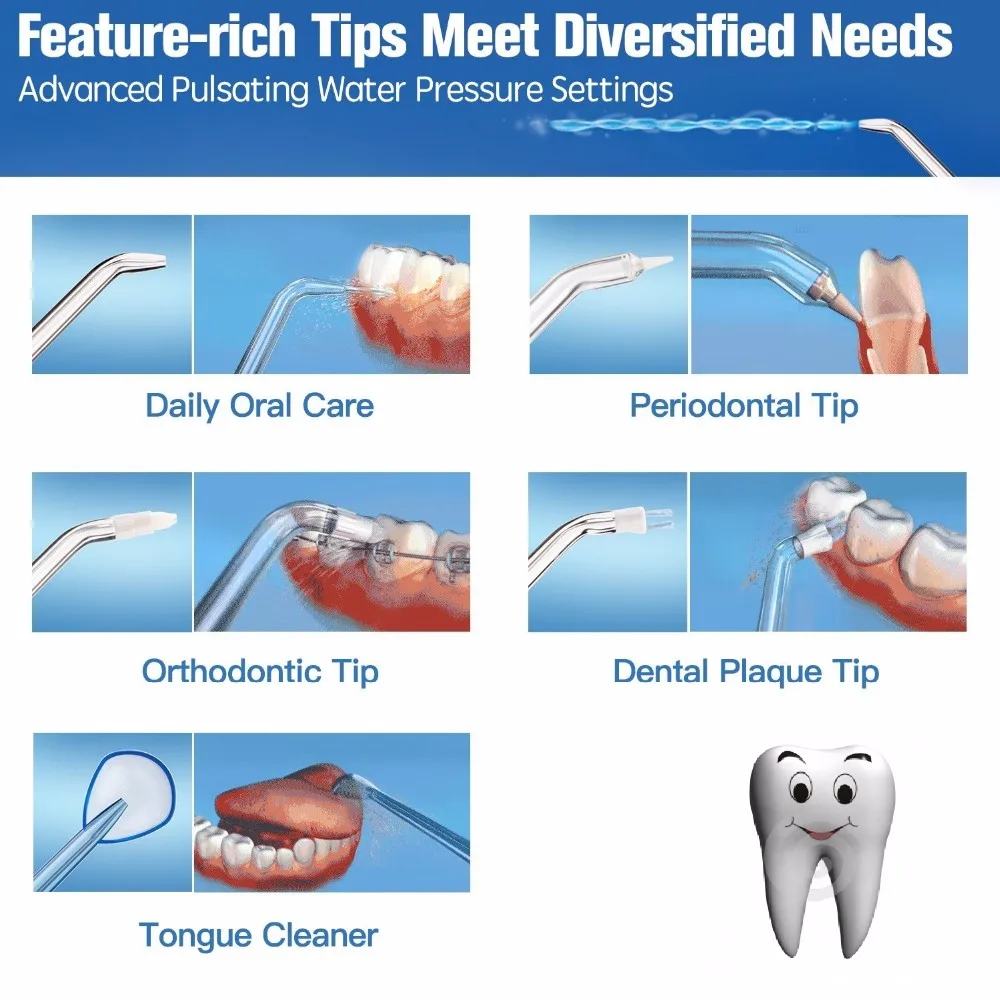 Регулируемые настройки пульсирующего давления воды-удаляет вредные микробы и пищевые дебаты между зубами и ниже гумлинии. Семейный пакет-с емкостью большого объема 1000 мл с крышкой и 7 типами наконечников, удовлетворяющих множество потребностей. Вращающееся сопло-регулируемый угол для очистки всех зон вашего рта. Кнопка паузы на ручке-временно останавливает поток в любое время. Тип: зубочистки и водяные нити Цвет: синий Аксессуары: 7 наконечников Дополнительные характеристики: удаляет глубокий мусор и бактерии Тип вилки: США, ЕС, Австралия Входное напряжение: 100 - 240 В 50/60 Гц Мощность: 18 Вт Длина электрического кабеля: 1,2 м Частота насоса: 1100-1500 об/мин