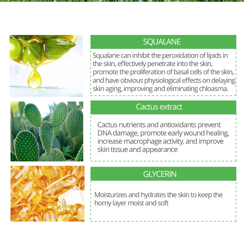 Сквалан Сквалан может подавлять перокисление липидов в коже, эффективно проникает в кожу, способствует пролиферации базальных клеток кожи и оказывает очевидное физиологическое воздействие на замедление старения изюма, улучшение и устранение хлоазмы. Экстракт Кактуса Питательные вещества и антиоксиданты кактуса предотвращают повреждение крови, способствуют раннему заживлению ран. Повышают макрофаговую активность и улучшают состояние кожи и внешний вид Глицерин Увлажняет и увлажняет кожу, чтобы сохранить слой hormy влажным и мягким