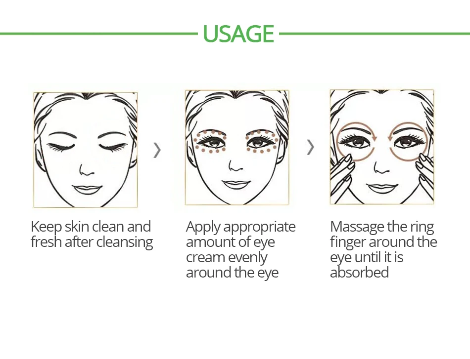 1. Сохраняет кожу чистой и восстанавливает после очищения 2. Нанесите соответствующее количество крема для глаз равномерно вокруг глаз 3. Массируйте безымянный палец вокруг глаз до тех пор, пока он не рассасывается