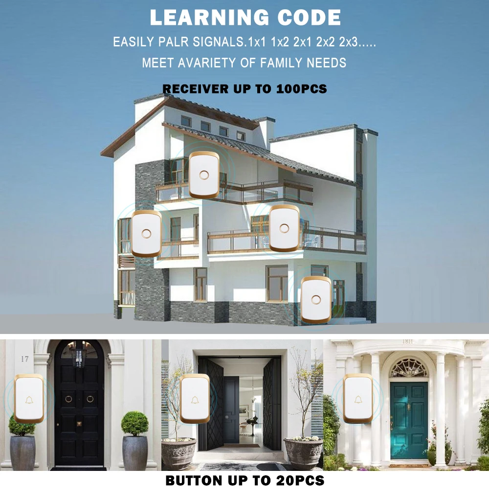 1. Кнопка поддерживает до 20 шт., а приемник поддерживает до 100 шт. 2. Если несколько кнопок соединены с одним или несколькими приемниками в одной системе, каждая кнопка может быть установлена на другой мелодии звонка. 3. Функция отключения памяти: Включите питание снова после выключения питания, не нужно повторно регулировать и блокировать мелодию звонка. 4. Передатчик не имеет винтового патрона, он может быть водонепроницаемым и пыленепроницаемым без резинового кольца. 5. Передатчик использует щелочную батарею 23A12V (не входит в комплект). 6. Напряжение приемника: 110-220 В. 7. Приемник доступен в различных вилках, штепсельных вилках США/ЕС/Великобритании и адаптерах Австралии, подходит для большинства стран. 8. Расстояние приема: 300 метров на открытой местности. 9. На беспроводной сигнал будут влиять препятствия. Чем больше препятствий, тем серьезнее потеря сигнала. 10. Приемник имеет 4 уровня 20-80 дБ, 36 музыки на выбор. 11. Размер: передатчик 77x46x20 мм, приемник 90x56x20 мм. Примечание: кнопка не может быть размещена на железной двери, потому что это будет мешать сигналу.