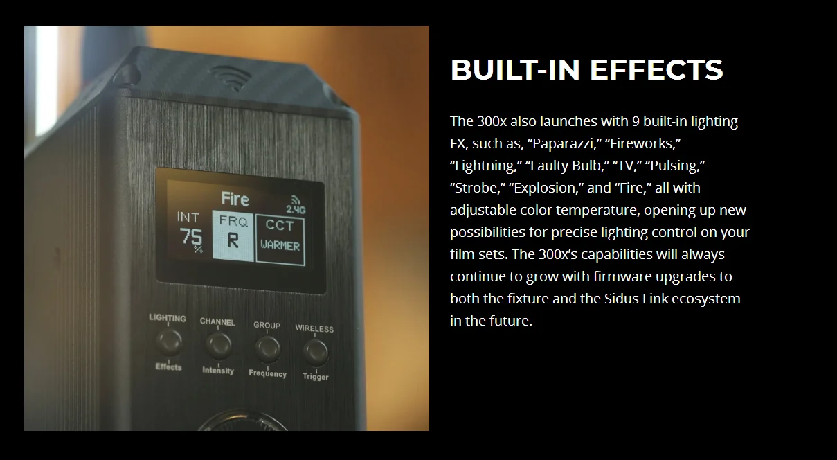 • 9 встроенных FX w/ CCT управления: папарацци, стробоскоп,